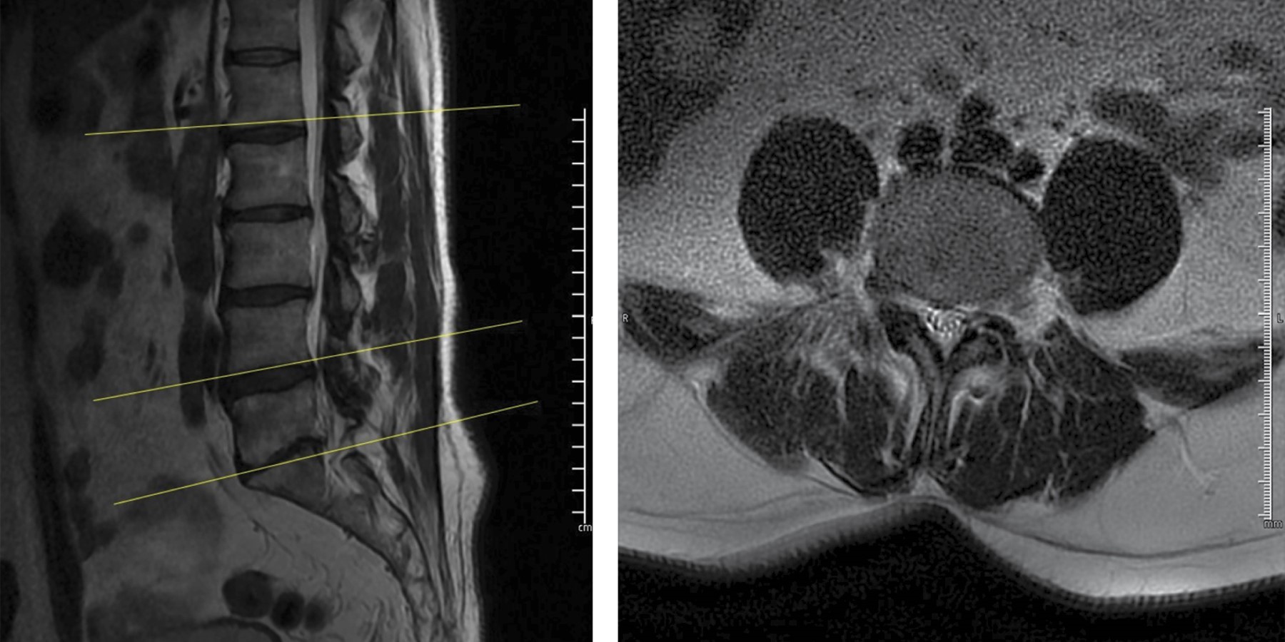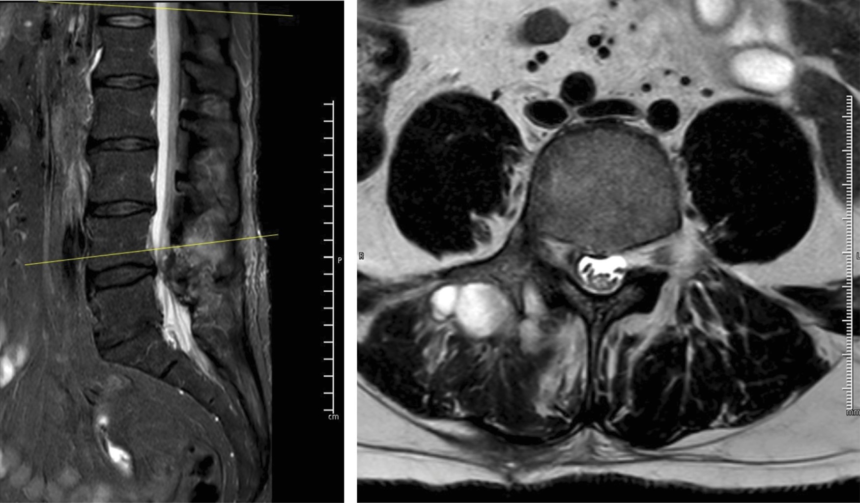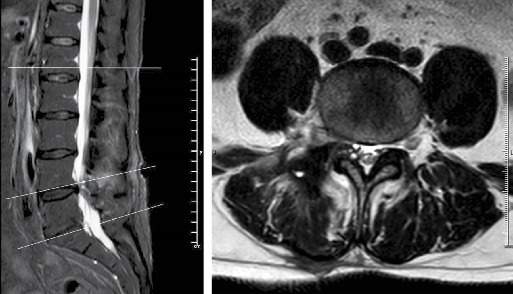 Paciente masculino de 62 años con antecedentes personales patológicos de hipertensión y discectomía en el año 2014. Inicia, en mayo de 2024, posterior a saltar de un banco de altura, con dolor súbito EVA 10/10 en la región glútea derecha irradiado por la parte posterior del muslo y entumecimiento de la región tibial anterolateral ipsilateral.