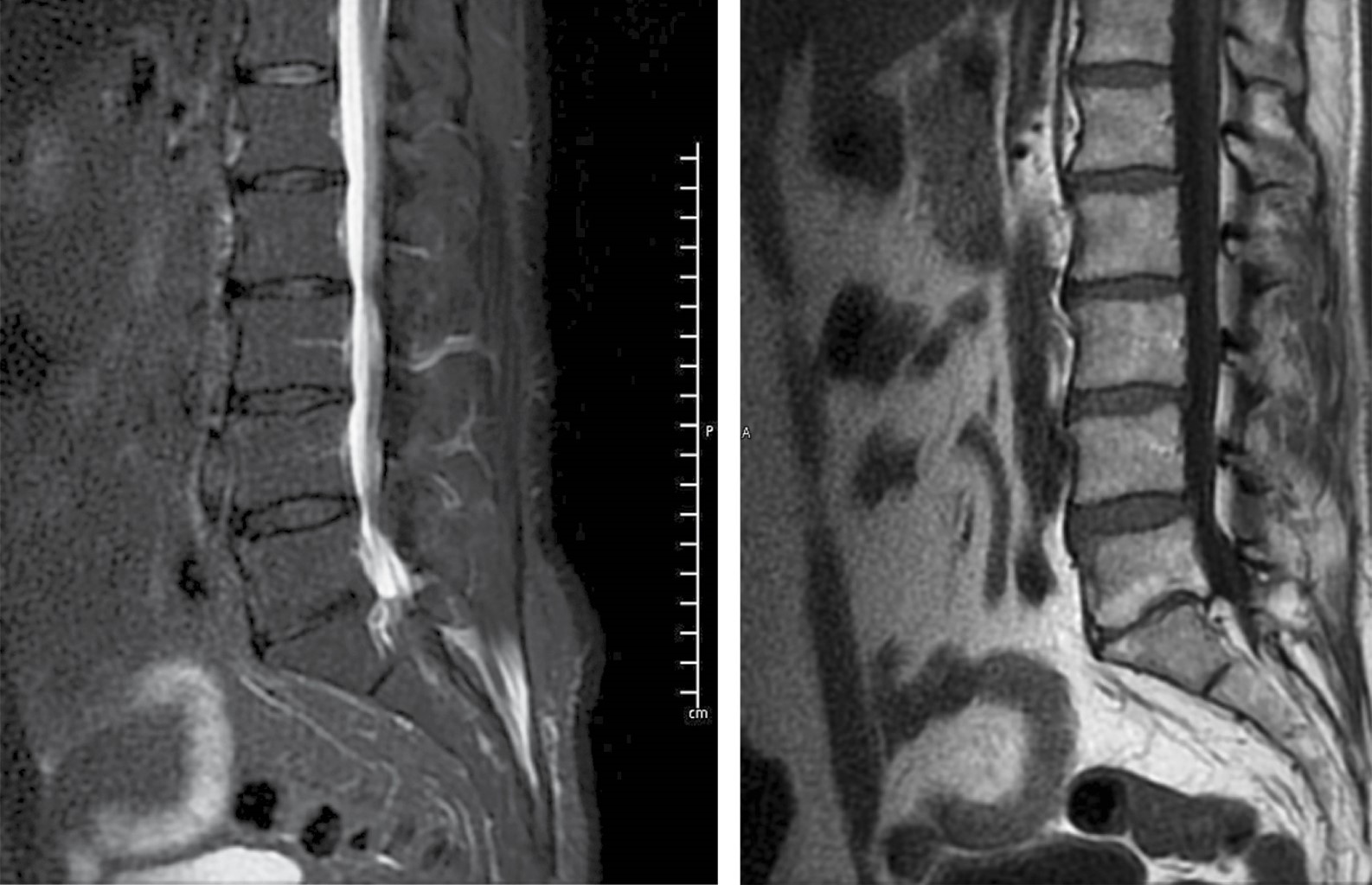 Se solicitó resonancia magnética simple de columna lumbosacra (Figuras 1 y 2), encontrando hernia discal extraforaminal L4-L5 derecha. Se decidió infiltración foraminal por la intensidad del dolor, sin embargo, no presentó mejoría, por lo que se decidió realizar microdiscectomía tubular tres días después. Se solicitaron estudios de laboratorio preoperatorios en los que se reportó leucocitos de 4.8 × 103 cel/mm3 con 44% de neutrófilos, proteína C reactiva (PCR) de 1.5 mg/l, velocidad de sedimentación globular (VSG) de 7 mm/h.