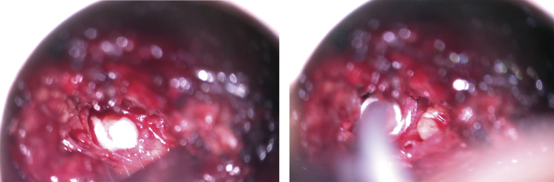 Después de realizar la microdiscectomía tubular, encontramos fragmento discal extraforaminal al igual que salida de material purulento (Figuras 3 y 4). Se tomaron muestras para cultivo, se realizó aseo quirúrgico y terminamos el procedimiento. El microorganismo aislado fue Staphylococcus aureus, por lo que se realizó interconsulta a infectología quien administró medicamento IV dirigido por antibiograma con ceftriaxona 2 gr IV cada 24 horas y daptomicina 500 mg IV cada 24 horas por seis semanas. Fue dado de alta a los cinco días después del procedimiento.