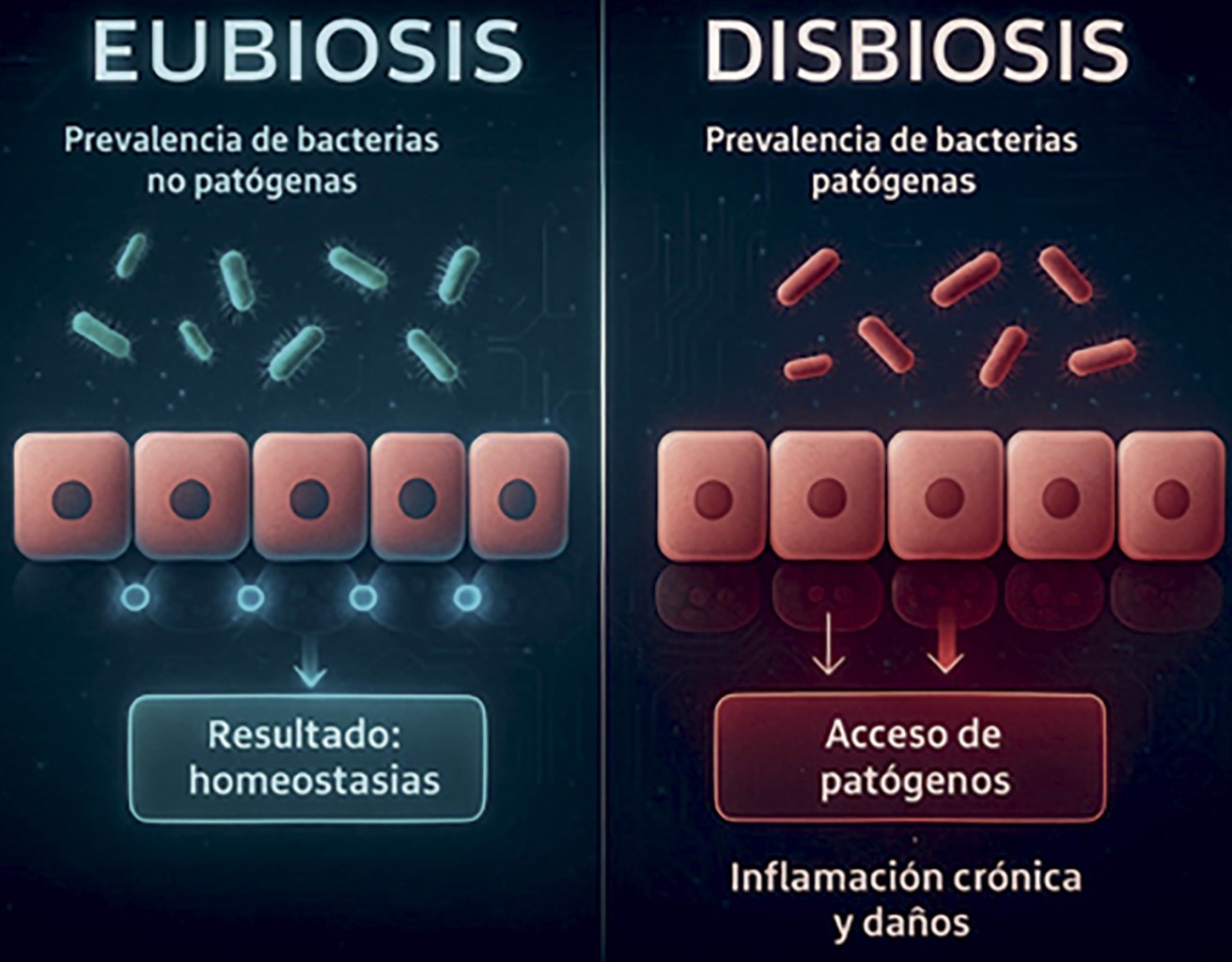 Enfermedades como la periodontitis y la caries presentan un alto riesgo de recurrencia y se consideran relacionadas con la disbiosis del microbioma y el metaboloma oral. En términos simples la eubiosis es el equilibrio de la microbiota, y la disbiosis es un desequilibrio en la composición y función del microbioma, la disbiosis es una disfunción orgánica. El equilibrio de los microorganismos residentes en cualquier parte del cuerpo humano se puede referir a la microbiota, que es el conjunto de microorganismos vivos como bacterias, hongos, virus y arqueas que habitan en un entorno específico del cuerpo humano, como la microbiota que residen en el biofilm de una bolsa periodontal o los microbios de una lesión cariosa profunda. La disbiosis es un fenómeno que se traduce en un desequilibrio en las especies bacterianas de nuestro cuerpo y afecta directa o indirectamente las funciones fisiológicas e inmunológicas. La disbiosis al ser el desequilibrio del microbioma, en conjunto abarca también al material genético, el DNA y RNA de todos los microorganismos presentes en una comunidad que pertenecen a un entorno en particular (metagenoma). En los seres humanos, el microbioma se refiere a los microorganismos que viven en una zona determinada del cuerpo y su contenido de interacción genético, tal como microbioma oral y microbioma intestinal. La disbiosis con el desequilibrio de la comunidad microbiana puede estar detrás de enfermedades como la diabetes, el cáncer, la periodontitis y otros trastornos autoinmunes con marcada presencia de múltiples citocinas como IL-1β, TNF-α, ROS (estrés oxidativo) y activación permanente de una inflamación sistémica crónica. Las alteraciones del microbioma pueden estar implicadas en la patogénesis de varias enfermedades no transmisibles y en la transición de estas afecciones hacia la cronicidad. La disbiosis es una alteración en la composición de la microbiota que sobrepasa las capacidades de resistencia y resiliencia del ecosistema microbiano.