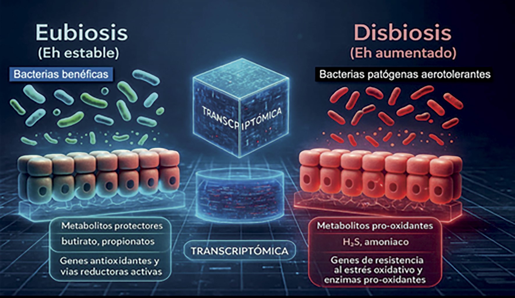 En eubiosis, la transcriptómica muestra expresión de genes antioxidantes y rutas metabólicas reductoras. En disbiosis, aumenta la transcripción de genes de resistencia al estrés oxidativo, enzimas prooxidantes y factores de virulencia. Esto permite mapear cómo el redox modula la función microbiana en tiempo real. Los microorganismos patógenos y sus metabolitos prooxidantes desarrollan más inflamación, el ciclo patológico se perpetúa, favoreciendo estados disbióticos persistentes. La transcriptómica, al analizar la expresión génica activa de las bacterias en tiempo real, ofrece una herramienta poderosa para comprender la dinámica funcional del microbioma. Esto permite diferenciar no sólo qué microorganismos están presentes, sino lo que están haciendo en un momento específico y cómo interactúan con el huésped. En un estado de eubiosis, la transcriptómica revela la activación de rutas metabólicas protectoras (producción de ácidos grasos de cadena corta, antioxidantes, moléculas antiinflamatorias), mientras que en la disbiosis se identifica la sobreexpresión de genes asociados a factores de virulencia, enzimas prooxidantes y resistencia a los antibióticos.