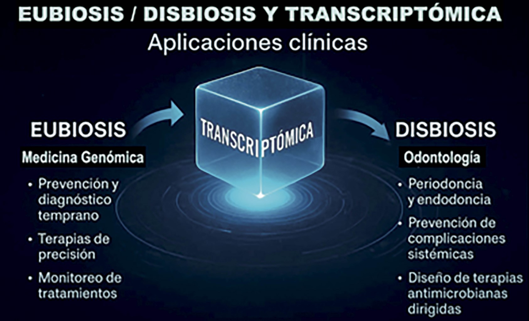En conclusión, la integración de la transcriptómica con estrategias para mantener o restaurar la eubiosis no sólo permite un control más fino del microbioma, sino que abre la puerta a una medicina y odontología de precisión, capaz de diagnosticar, tratar y prevenir enfermedades basándose en la función real de las comunidades microbianas, más allá de su simple presencia (Figura 3).