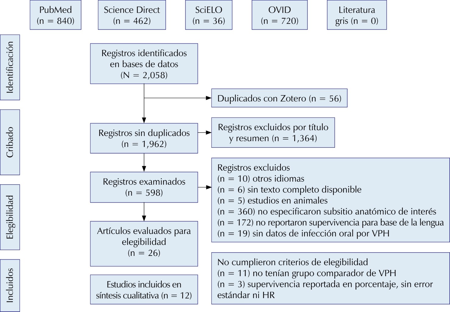 Criterios de elegibilidad. Se incluyeron estudios con pacientes diagnosticados con cáncer de base de lengua que medían infección oral por VPH y supervivencia, con textos completos en español o inglés. Se aceptaron diseños de cohorte retrospectiva, casos y controles, o cohorte prospectiva, publicados en revistas médicas o literatura gris reciente.