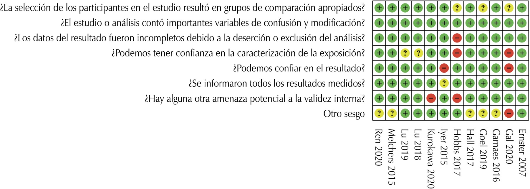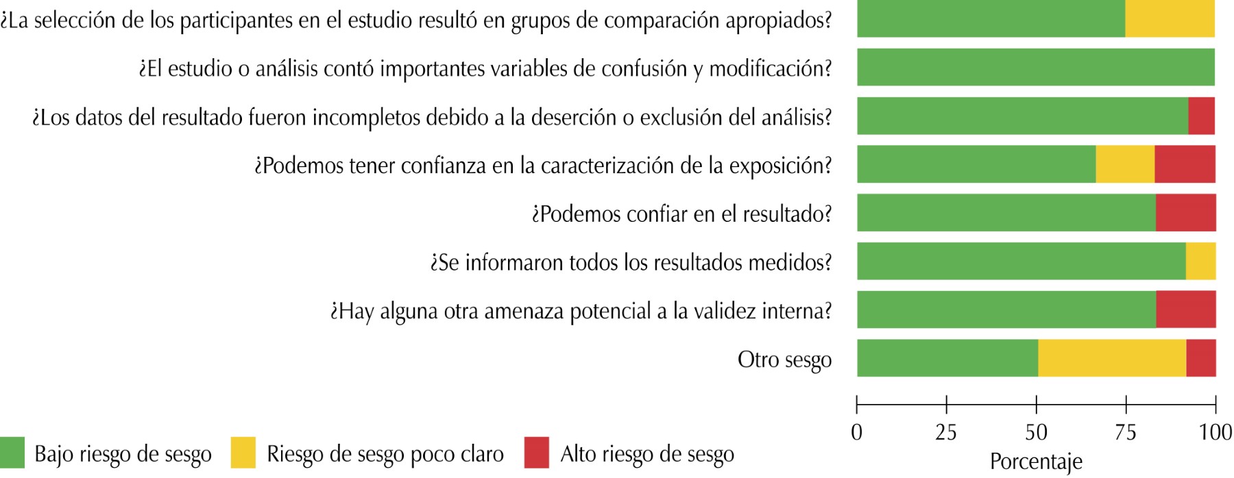 Criterios de evaluación de sesgos. Se empleó el software Review Manager 5.4, que clasifica el riesgo como bajo, alto o poco claro, siguiendo el Manual de Cochrane.