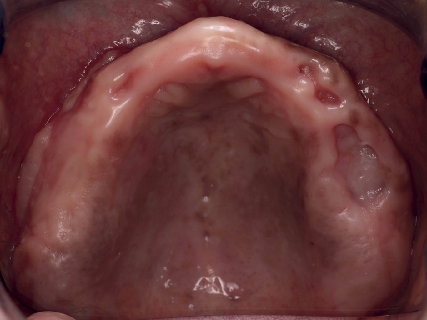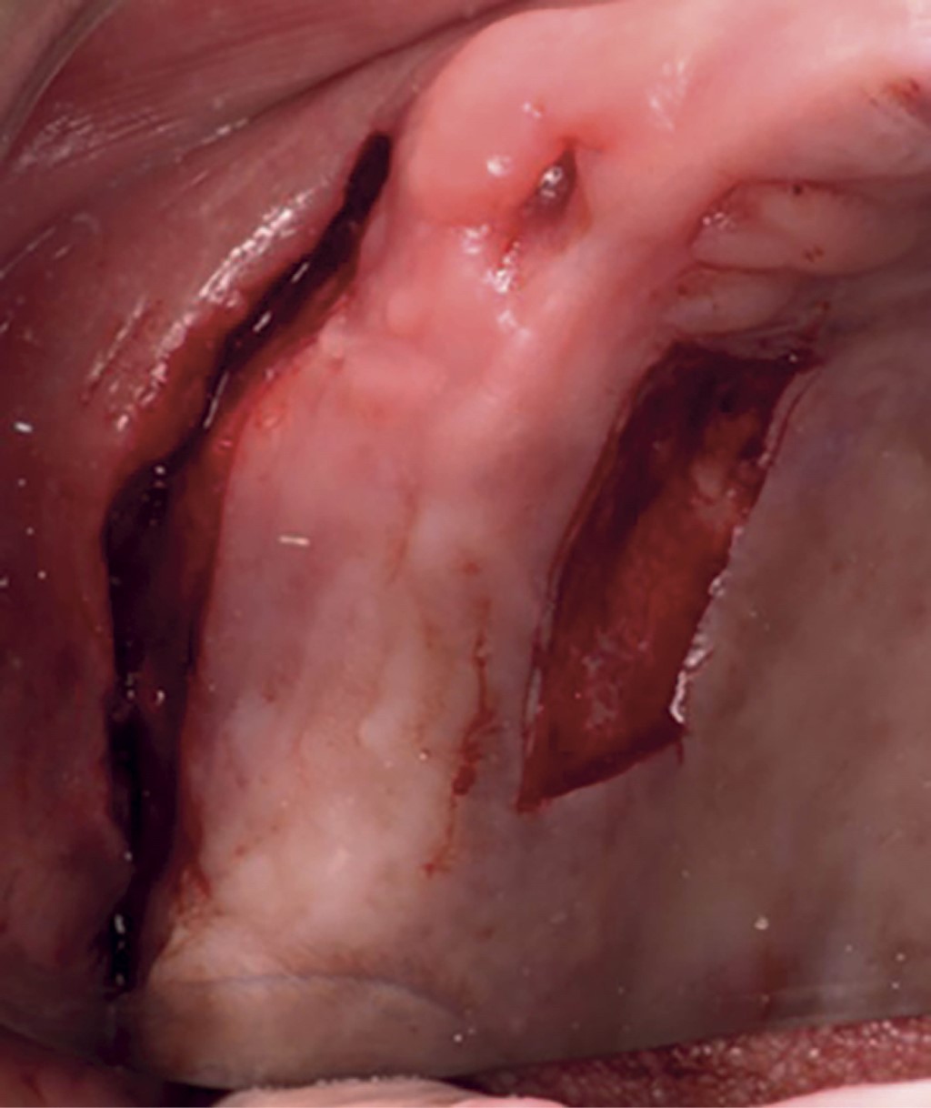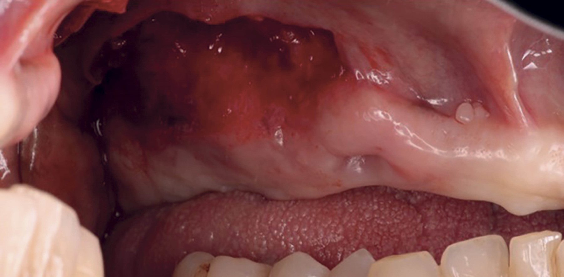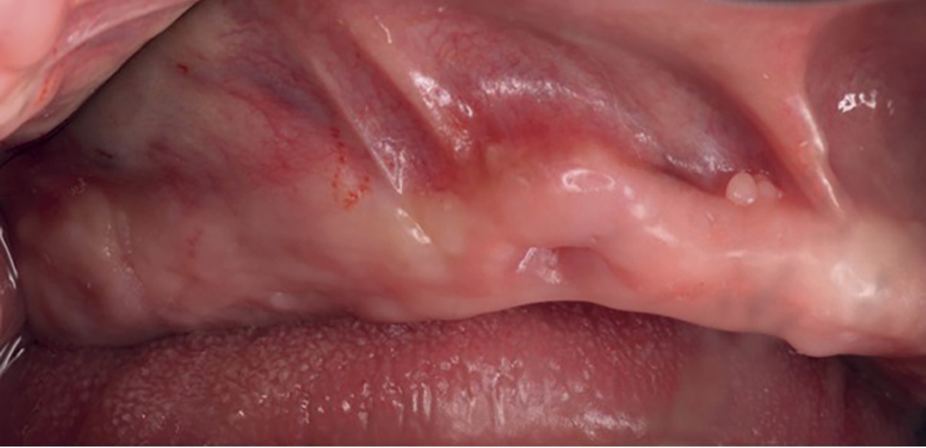 Se realizó interconsulta con el departamento de prostodoncia, donde el diagnóstico protésico para rehabilitación dental no fue viable para la rehabilitación protésica del maxilar. Por lo que se expuso el plan de tratamiento al paciente que consistió en realizar extracciones de los dientes remanentes 1.3, 2.3, 2.4, 2.5 y 2.6 preservando el alveolo para en el futuro colocar una dentadura implantosoportada mediante cuatro implantes en la arcada superior, sin embargo, posterior a la extracción de los dientes maxilares, se propuso realizar una vestibuloplastia con IGL para la obtención de encía queratinizada y un vestíbulo profundo para la rehabilitación protésica temporal (Figura 1).