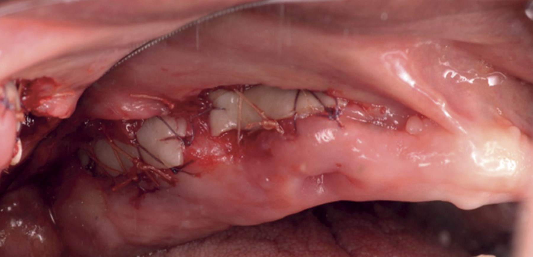 El tratamiento de vestibuloplastia en conjunto con un IGL nos proporcionó dimensiones de profundidad de vestíbulo adecuadas y se obtuvo el tejido queratinizado suficiente para un futuro manejo de la rehabilitación de la zona. Además, no se encontraron signos de inserción muscular, considerándose un éxito en la intervención quirúrgica.