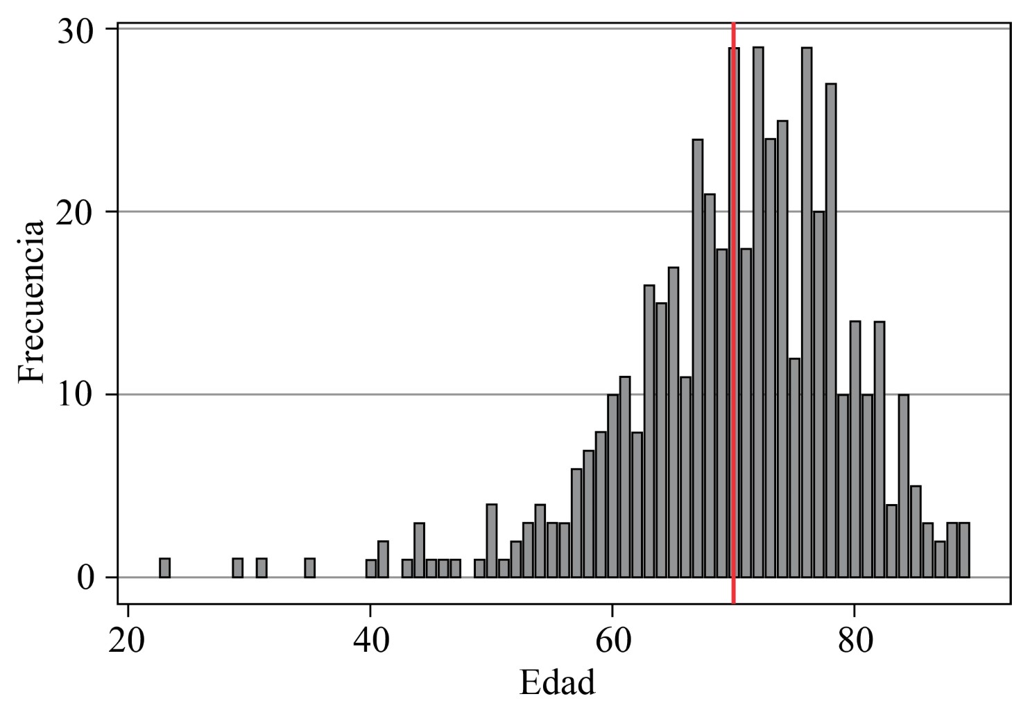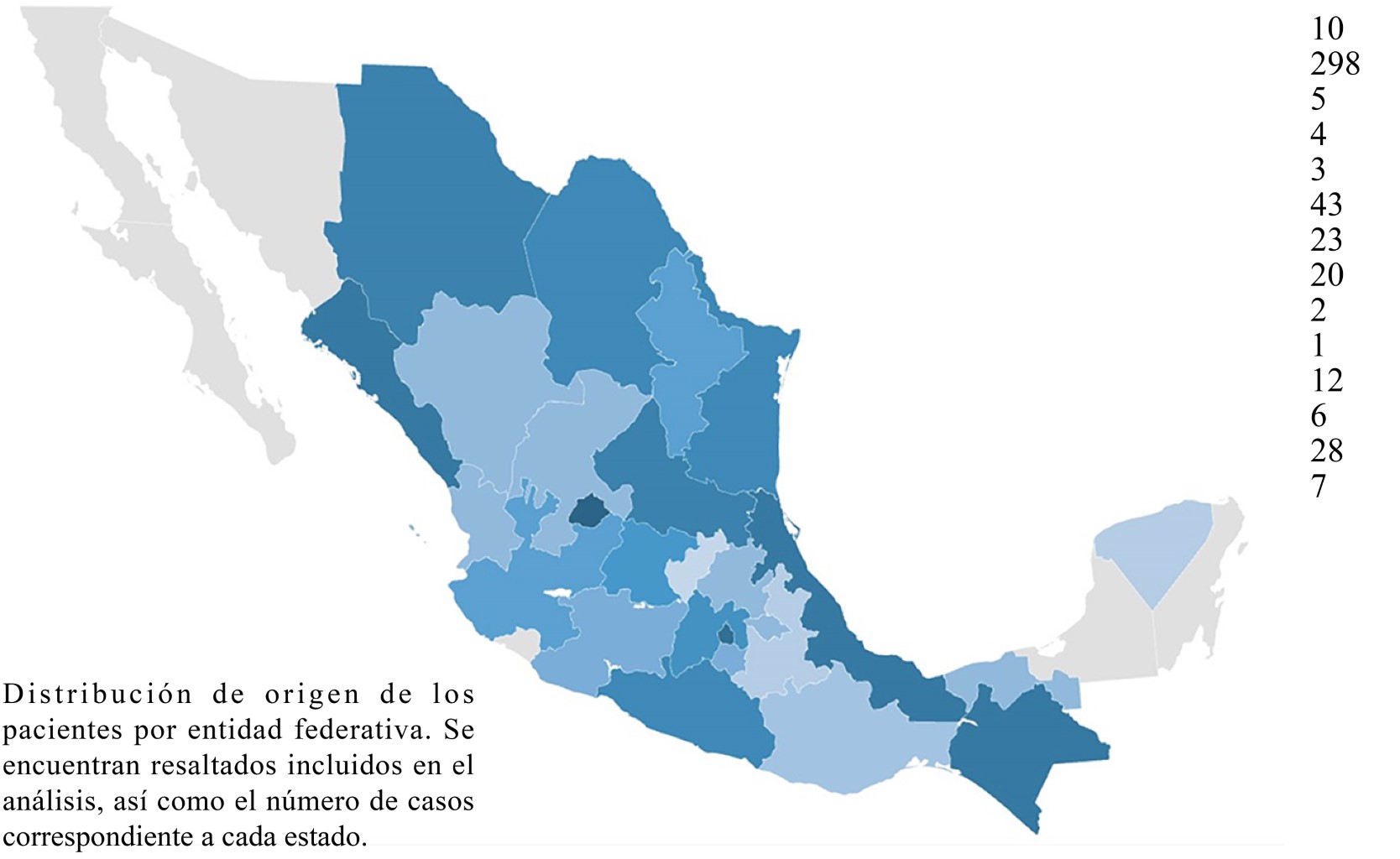 Los pacientes incluidos en el estudio provinieron de 26 de las 32 entidades federativas de la República Mexicana (Figura 1). De acuerdo con las respuestas recibidas, se incluyeron 516 pacientes; 353 (68.41%) fueron mujeres. La edad media fue de 70.09 ± 9.5 años (rango de 23.0 a 89.0 años) y su distribución por edad se muestra en la Figura 2.
