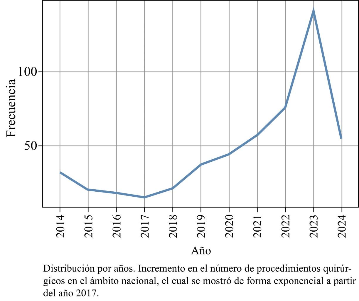 Además, se observó un incremento en el número de procedimientos quirúrgicos nacionales, el cual se mostró de forma exponencial a partir del año 2017, al igual que los reportes en los registros de la Academia Americana de Cirujanos Ortopédicos (AAOS) en 2023, lo cual va en contra de lo registrado por la Asociación Ortopédica Australiana (AOA), quienes reportaron una disminución de hasta 3% en los procedimientos en 2022, posiblemente vinculado a la pandemia mundial por COVID-19.27