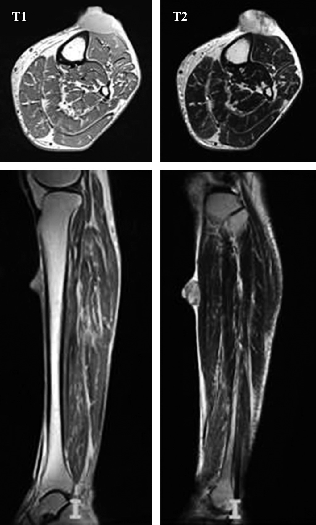 Las radiografías simples mostraron aumento de volumen en tejidos blandos y una lesión radiopaca en región proximal de pierna izquierda (Figura 2). En las imágenes de resonancia magnética se encontró una lesión nodular localizada en piel y tejido celular subcutáneo de la cara anterior del tercio proximal de la pierna izquierda con bordes parcialmente delimitados, lobulados con edema de tejidos blandos adyacentes sin compromiso de la fascia muscular, de comportamiento hipointenso en T1 e hiper/isointenso en T2 y T2 FAT-SAT, con comportamiento heterogéneo de aproximadamente 26 × 27 × 17 mm (Figura 3).