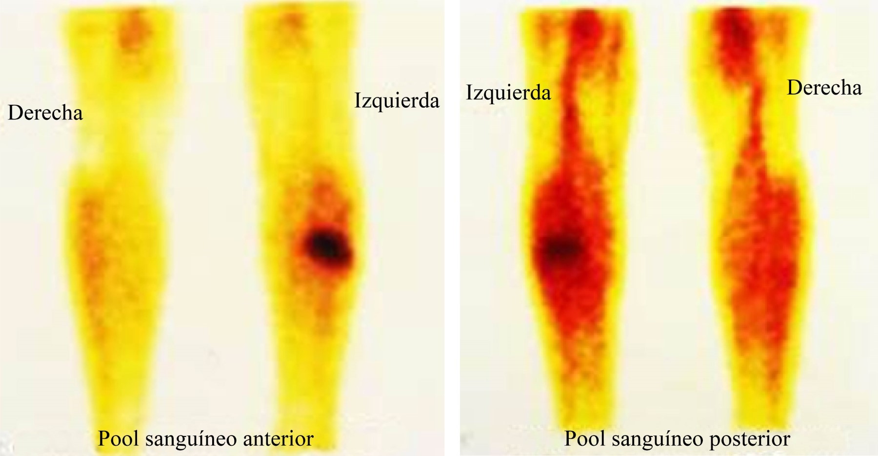 Ante los hallazgos en los estudios de imagen, se complementaron con gammagrafía ósea de tres fases con 99mTc-MDP, la cual reportó flujo y pool sanguíneo incrementados focalmente en tercio medio de pierna izquierda, en relación con la lesión ricamente vascularizada en tejidos blandos e incremento en la actividad osteoblástica en tercio superior y medio de la cara anterior de tibia izquierda (Figura 4).