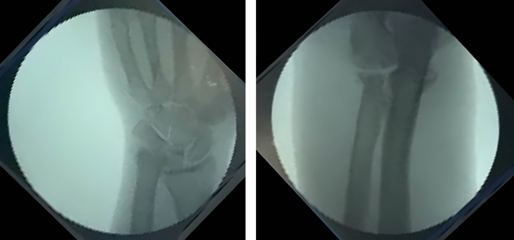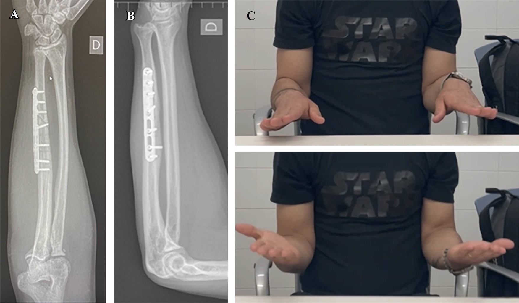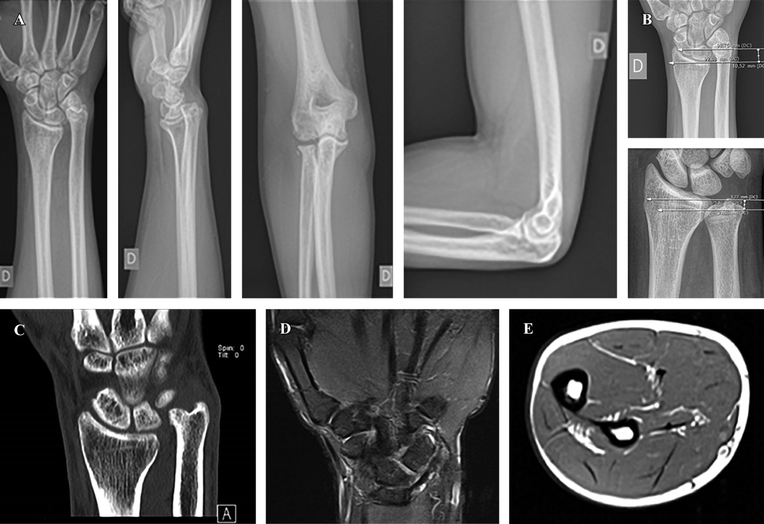 Caso clínico: se describe el caso de un varón de 30 años que sufrió un accidente de moto en 2019. Diagnosticado inicialmente de fractura conminuta de cabeza radial derecha, fue tratado inicialmente mediante resección de la misma. El paciente visitó nuestro centro en 2023, la exploración clínica mostró dolor en muñeca y una protrusión dorsal de cúbito reductible pero inestable, sin dolor ni limitación de movimiento en el codo y antebrazo. Las pruebas complementarias, radiología simple y RMN, mostraron una varianza cubital positiva, una subluxación dorsal del cúbito a nivel de la muñeca y una lesión del CFCT, sin evidencia de ruptura aguda de la MIO. Se llevó a cabo un examen bajo anestesia y una evaluación fluoroscópica para examinar la estabilidad y el rango de movimiento del codo y la ARCD, así como la estabilidad longitudinal del antebrazo mediante tracción. Al no observarse inestabilidad longitudinal, se realizó una osteotomía de acortamiento del cúbito de 10 mm y se fijó con una placa y tornillos. De forma artroscópica, se observó la desinserción del CFCT y se reinsertó mediante una modificación de la técnica de Mantovani. Se inmovilizó con una férula de Münster. A los seis meses de seguimiento, tiene un EVA de 0 en codo y muñeca, y una flexión dorso/volar de 80º/80º, y un déficit de supinación/pronación de 10o/10o.