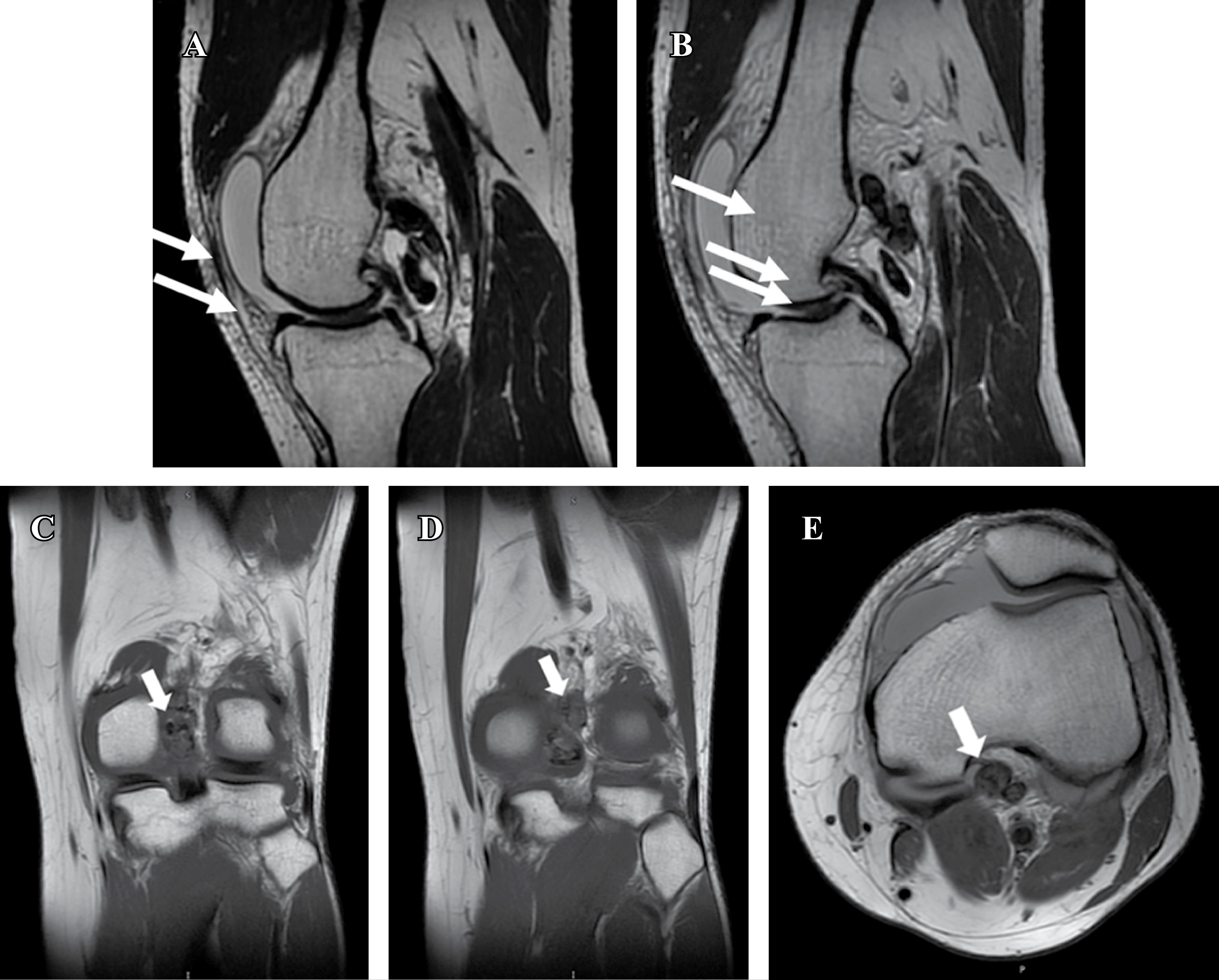 En radiografías anteroposterior (AP) y lateral de rodilla, no se encontraron datos patológicos, por lo que se decidió la realización de una resonancia magnética (RM) simple, en la cual, además de lesión grado I en menisco medial y ligamento cruzado anterior (LCA), se identificó entre la cápsula posterior y el ligamento cruzado posterior al menos cuatro imágenes ovoides, con bordes bien definidos y comportamiento heterogéneo, predominantemente hiperintenso en secuencia de densidad protónica con supresión grasa (Proton Density Fat-supressed Sequence: PD-FS), hipointenso en T1 y T2 y sin señal en la secuencia de susceptibilidad magnética, con un tamaño aproximado de 7 a 20 mm (Figura 1). Se descartó el uso de ultrasonido por tener disponibilidad inmediata de RM.