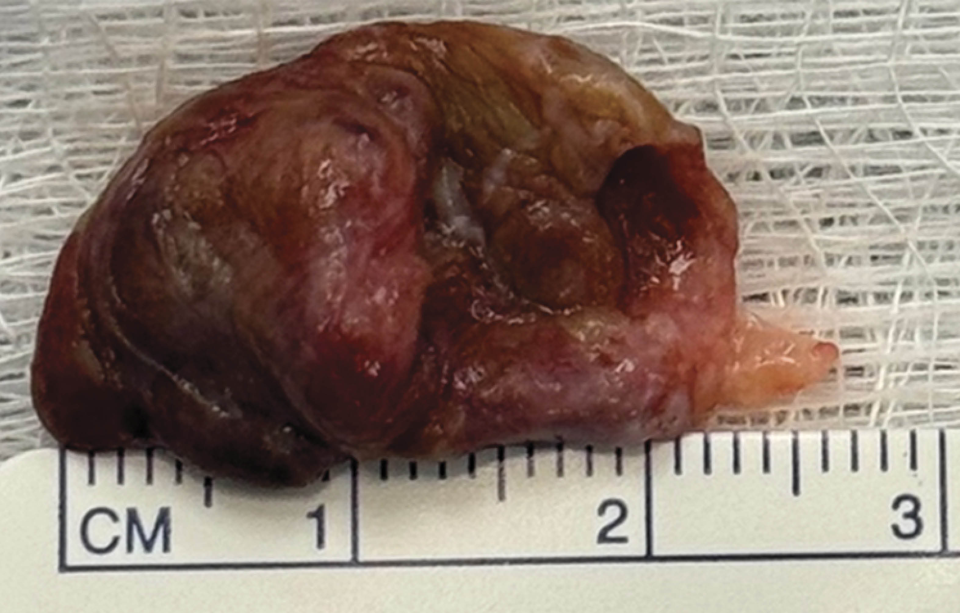Macroscópicamente, el TGCT suele presentarse con uno o varios nódulos pediculados de color marrón amarillento, de tamaño entre 1 y 6 cm, con un promedio de 2 cm.1 Estos nódulos son firmes, elásticos y muestran una lobulación característica.7