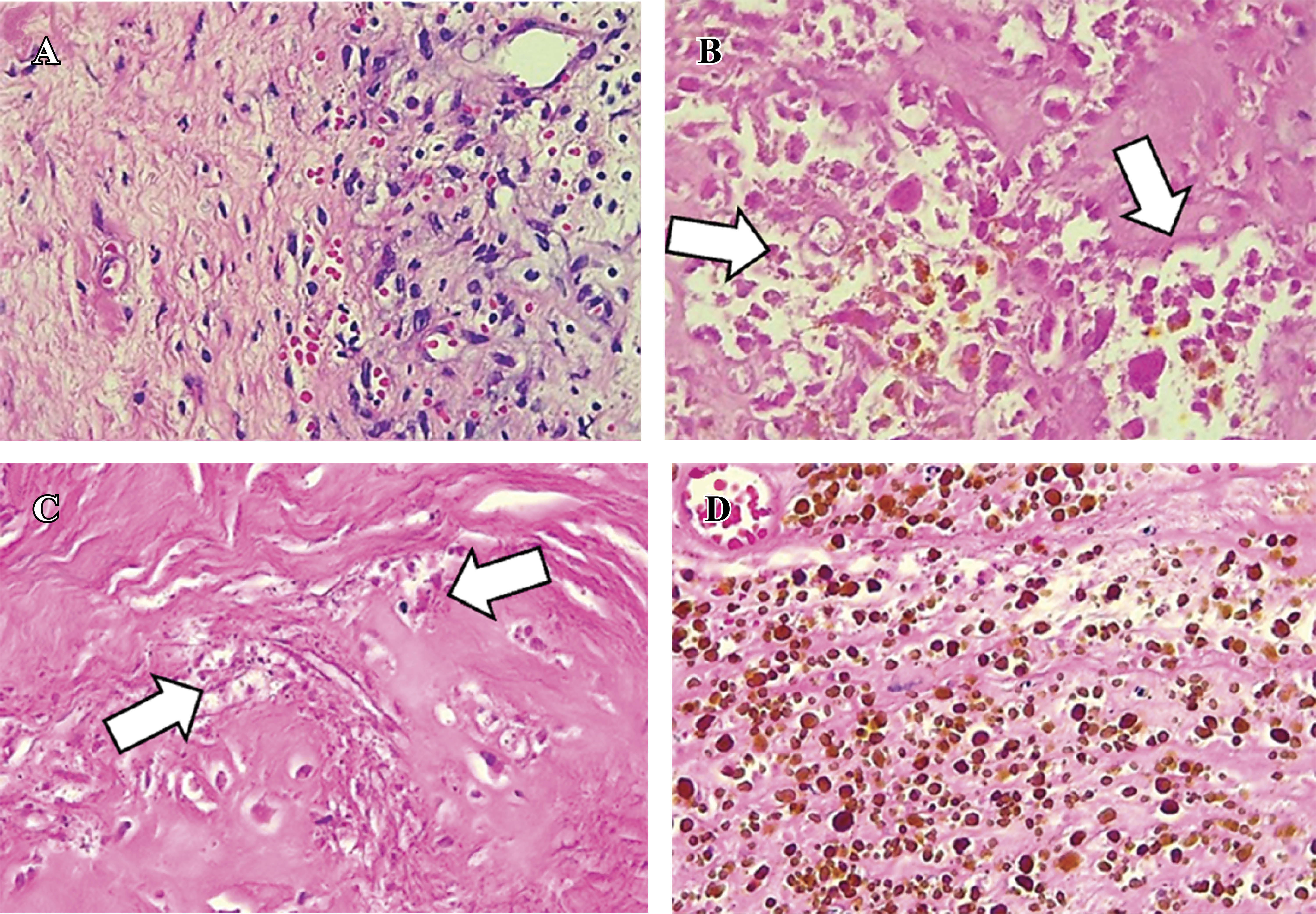 Se realizó una artroscopía de rodilla izquierda (Figura 2), sin encontrar lesiones meniscales, condrales o ligamentarias; sin embargo, al acceder al espacio posterior por portal posteromedial y posterolateral, se visualizó una masa adherida a la cápsula posterior, de forma irregular, con áreas nodulares y una superficie de color café amarillento. Ante estos hallazgos, se decidió establecer un portal posteromedial para realizar el desbridamiento periférico posterior y la exéresis completa de la lesión logrando la resección sin dificultades (Figura 3); se envió a patología transoperatoria confirmando bordes libres, con su posterior análisis por dicho servicio, revelando que los fragmentos de tejido examinados corresponden a una proliferación fibrohistiocítica con patrón de crecimiento nodular, tejido fibroconectivo con numerosos histiocitos cargados de pigmento de aspecto hemosidérico y extensas áreas de hialinización, además de bordes libres. Estos hallazgos son consistentes con el tumor tenosinovial de células gigantes tipo localizado (Figura 4).