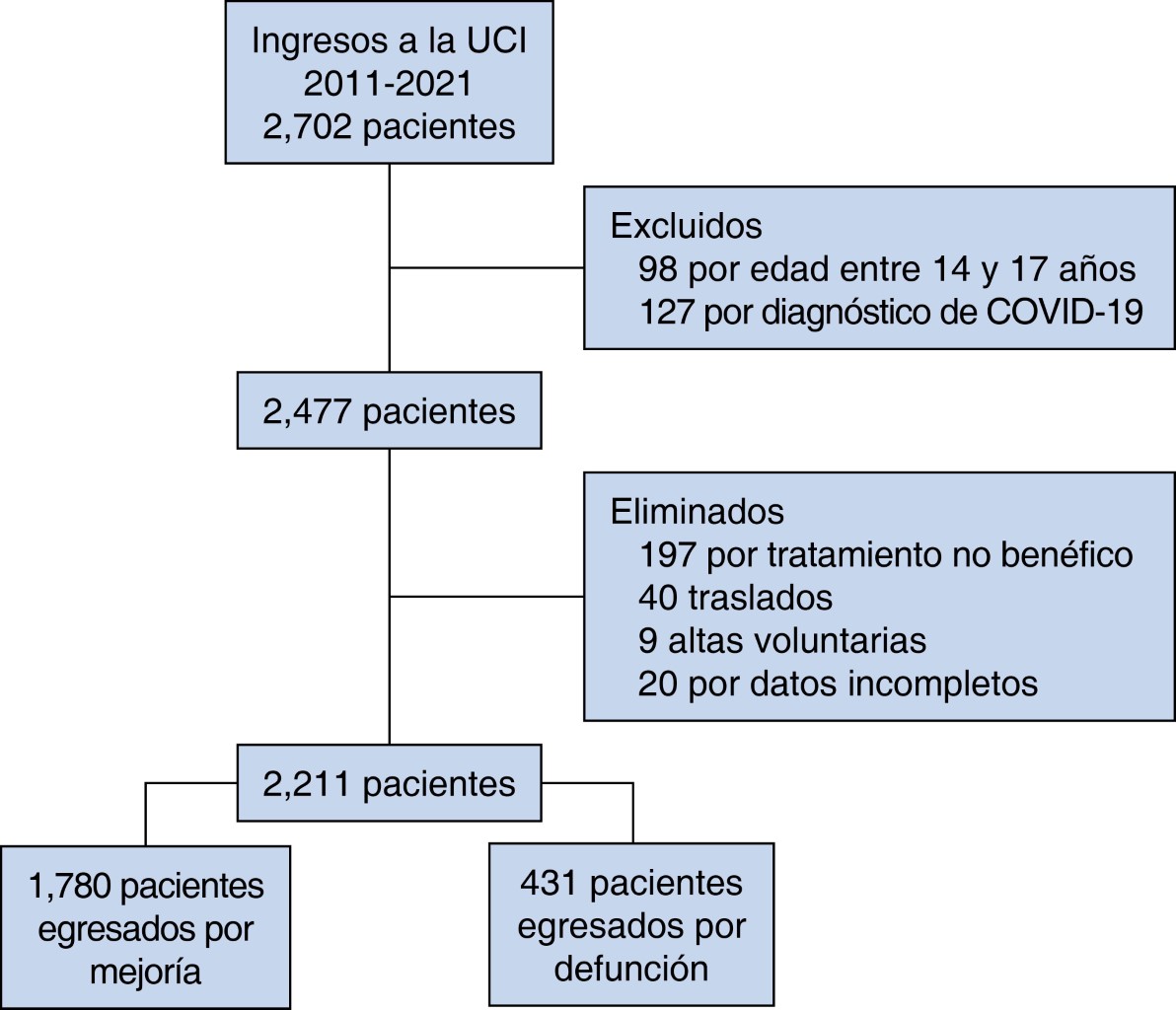 El presente es un estudio observacional, retrospectivo, de pacientes mayores de 18 años que ingresaron a una UCI de segundo nivel de atención en el norte de México desde enero de 2011 hasta diciembre de 2021. Se excluyeron pacientes menores de edad y los que ingresaron por diagnóstico de COVID-19. Fueron eliminados de este estudio pacientes no localizables o con datos incompletos, enfermos que se trasladaron, que se egresaron por alta voluntaria o por tratamiento no benéfico.
