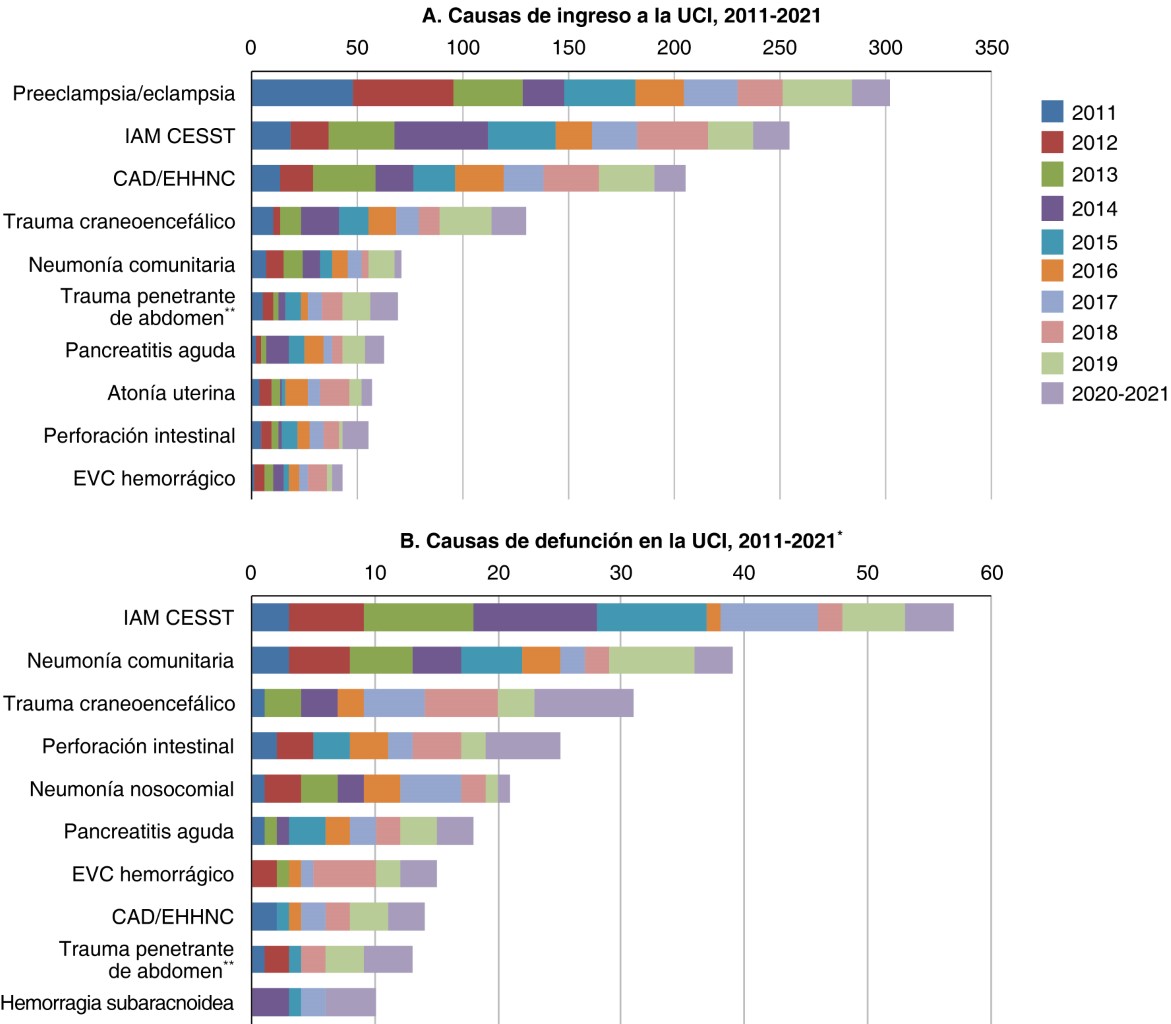 Los principales diagnósticos de ingreso fueron la emergencia hipertensiva del embarazo, el infarto agudo de miocardio, las crisis hiperglucémicas, la neumonía y los traumatismos, llamando la atención el penetrante de abdomen, ya que en su mayoría es causado por proyectil de arma de fuego y es un reflejo de la condición social que actualmente se vive. En contraste, los principales diagnósticos relacionados con la mortalidad son los infartos, las neumonías, el traumatismo cráneo encefálico y la perforación intestinal no traumática. Respecto al infarto como causa de muerte, previamente hemos realizado un análisis en nuestro medio donde el retraso en la búsqueda de la atención y la falta de acceso a intervencionismo percutáneo temprano son condicionantes de la misma.13