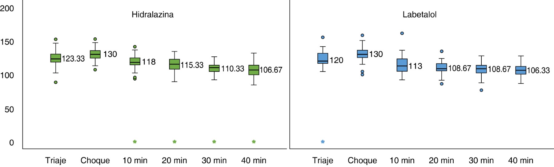 En cuanto al control de las variables hemodinámicas, ambos fármacos mostraron reducción de las TAS, TAD, presión arterial media (TAM) y frecuencia cardiaca (FC) (p ≤ 0.001), comparando los valores iniciales en el servicio de triaje y los registrados al minuto 40 dentro de cada grupo; sin embargo, se observó que el control hipertensivo se lograba en un menor tiempo en el grupo de labetalol.