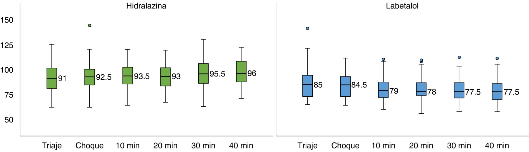 En este contexto, al comparar el resultado final de las variables hemodinámicas al minuto 40 entre ambos grupos se obtuvieron desenlaces similares con valores de TAS en 140 mmHg (p = 0.222), TAD de 90 mmHg (p = 0.563) y TAM de 106 mmHg (p = 0.729) (Figura 1); sólo en la variable de frecuencia cardiaca se observó una mayor reducción a favor del grupo de labetalol 77.5 latidos por minuto (lpm) versus hidralazina con 96 lpm (p ≤ 0.001) (Figura 2).
