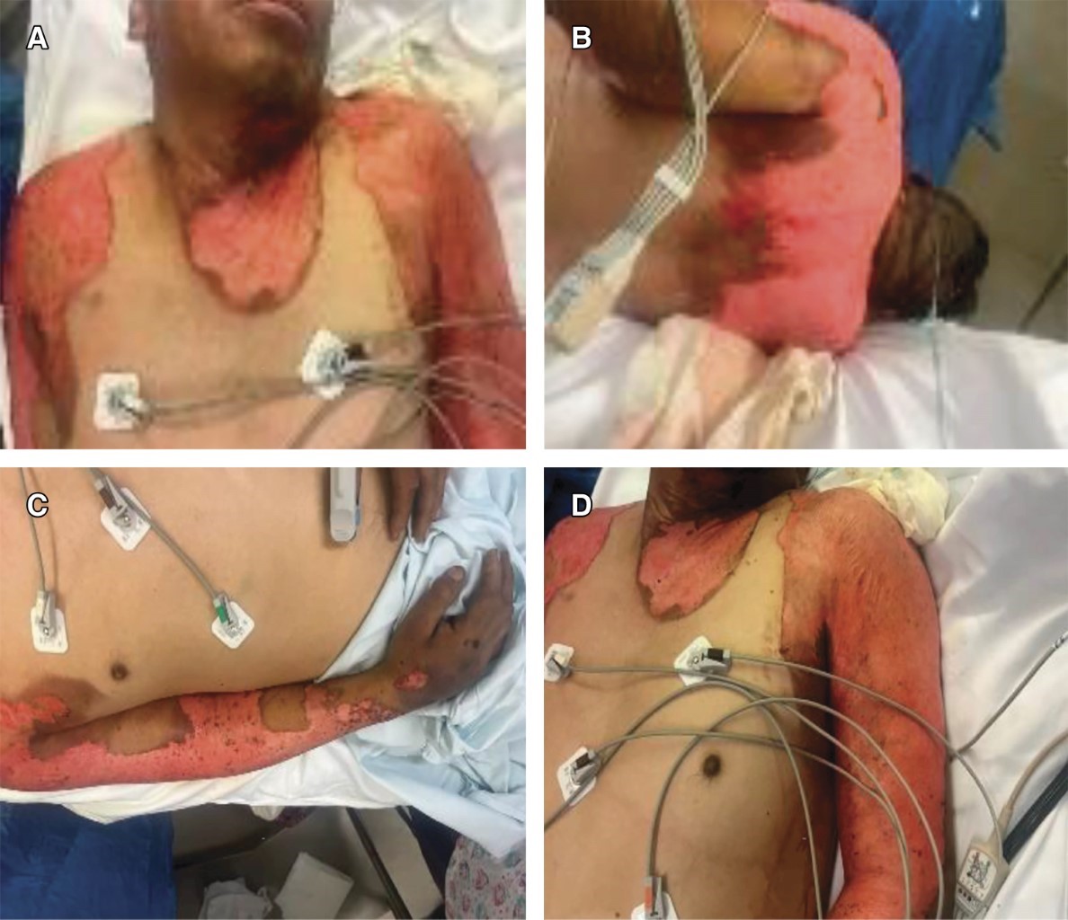 Hombre de 37 años con diagnóstico de quemadura eléctrica + fulguración de 17.7% superficie corporal quemada (SCQ) (Figura 1). Presentó politraumatismo secundario a caída de cinco metros de altura con pérdida del estado de alerta y amnesia postraumática al ser proyectado por arco voltaico. Al ingreso con evaluación neurológica, Glasgow de 15 puntos, con disminución de fuerza en ambos miembros superiores 3/5 escala de Daniels bilateral, sensibilidad superficial y profunda conservada; como protocolo de estudio de paciente politraumatizado se solicitaron estudio se imagen: tomografía simple columna y resonancia magnética (Figura 2) con evidencia de fractura en C6 tipo A0, T5, T9, T11 tipo A1, fractura A4 de L5, herniación discal C6 y C7. Como complicaciones asociadas, cursó con lesión renal aguda por rabdomiólisis sin requerir tratamiento sustitutivo de la función renal.