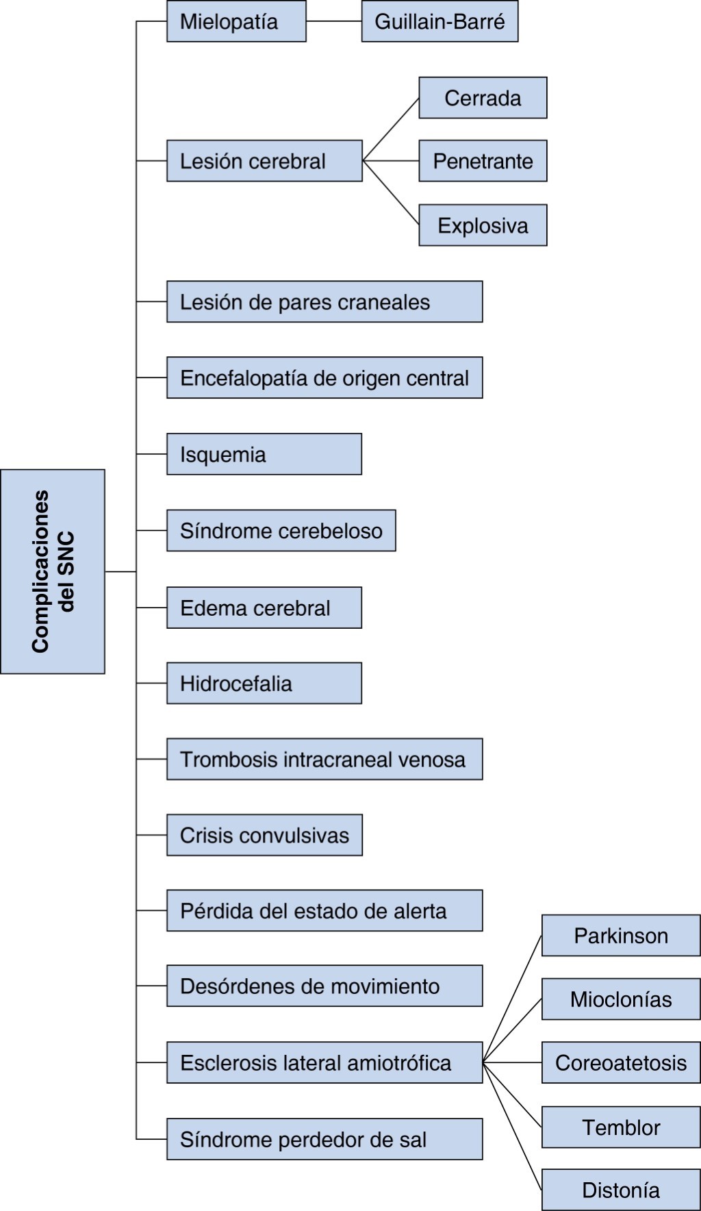 Lesión cerebral: definida cómo la alteración de la función cerebral o evidencia de patología a este nivel ocasionada por una fuerza externa. Puede ser causada por efecto directo de la descarga eléctrica o indirecto secundaria a la caída. Dependiendo del mecanismo de la lesión, la lesión cerebral se puede dividir en tres tipos: cerrada, penetrante o explosiva. Lesiones cerebrales moderadas y severas secundarias a quemadura eléctrica se han asociado con estado de coma, paresia, afasia, crisis convulsivas, cefalea, náusea y alteraciones de la memoria; algunos de estos se presentan inmediatamente posterior a la lesión mientras que otros persisten por meses o años. Se ha observado también la presencia de contusiones cerebrales, edema y atrofia cerebral, hematoma subdural, hemorragia subaracnoidea, hemorragia intraparenquimatosa y hemorragia intraventricular.