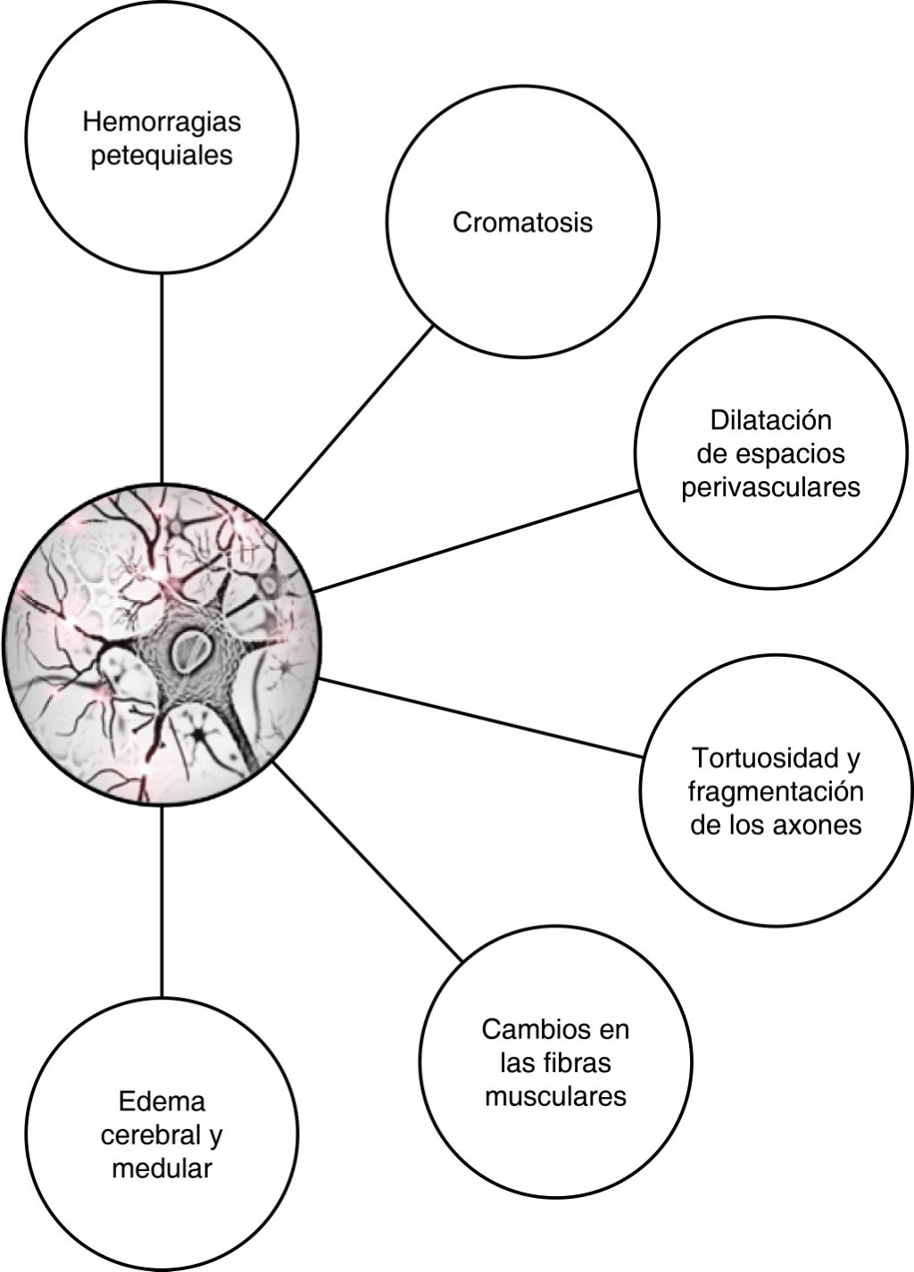 Cromatólisis: especialmente en las células piramidales de núcleos medulares, en las células del asta anterior y células del cerebelo; son cambios irregulares, pero bien delimitados.