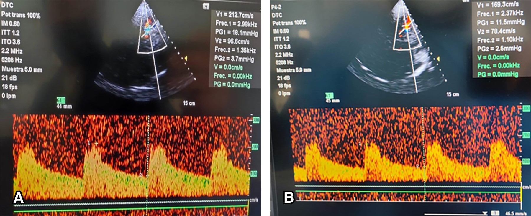 Posterior al procedimiento quirúrgico se continuó con el tratamiento y neuromonitoreo a través de ultrasonido Doppler transcraneal, el cual evidencia descenso de las velocidades de flujo en ambas arterias cerebrales medias. Al cuarto día desde su ingreso, se inicia prueba de despertar espontáneo, lográndose el retiro de la ventilación mecánica. Sin embargo, al quinto día de estancia, la paciente presentó nueva sintomatología neurológica caracterizada por ataxia en la extremidad torácica derecha a nivel de la mano y hemiparesia facial izquierda; el Doppler transcraneal muestra, a nivel de la arteria cerebral media de lado derecho, incremento de velocidad media hasta 125 cm/s, cambios sugestivos de nuevo episodio de vasoespasmo en la circulación de lado derecho.