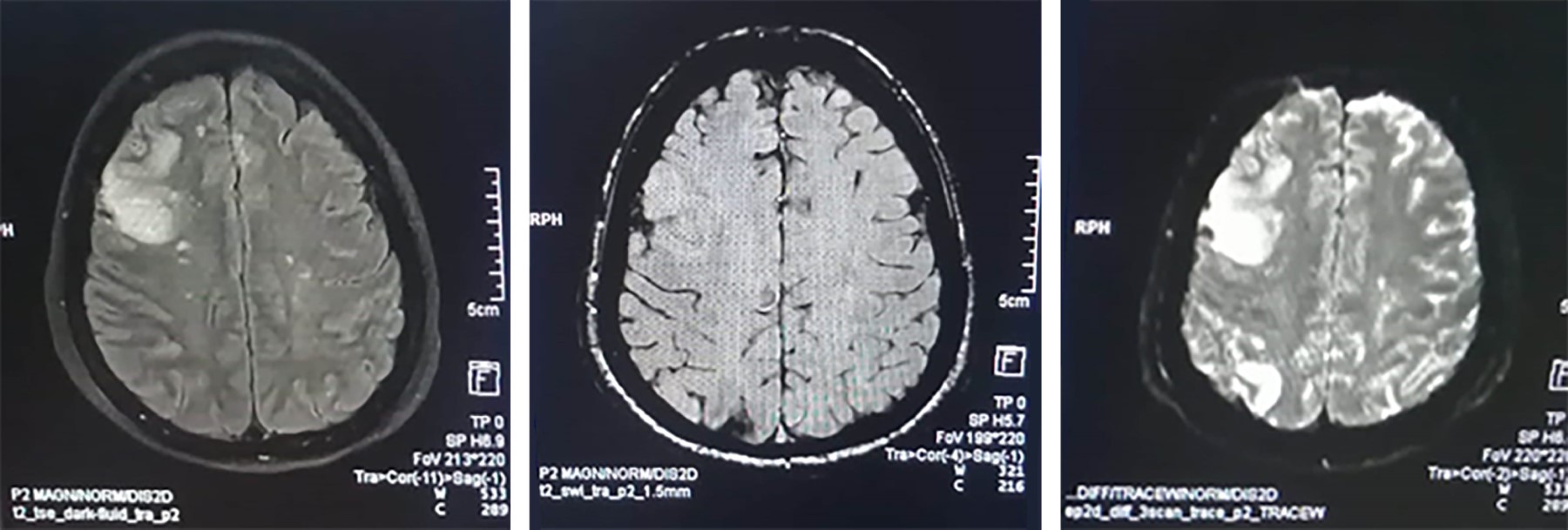 Además, como parte del protocolo diagnóstico, se realizó angiorresonancia cerebral, en la cual se evidenció la presencia de un hematoma fronto-basal derecho de 52.4 × 23.8 × 29.9 mm y un volumen estimado de 20 mililitros en fase aguda temprana con edema perilesional, sangrado subaracnoideo, espasmo de la arteria cerebral media de lado izquierdo y un aneurisma en la arteria comunicante anterior (Figura 2).