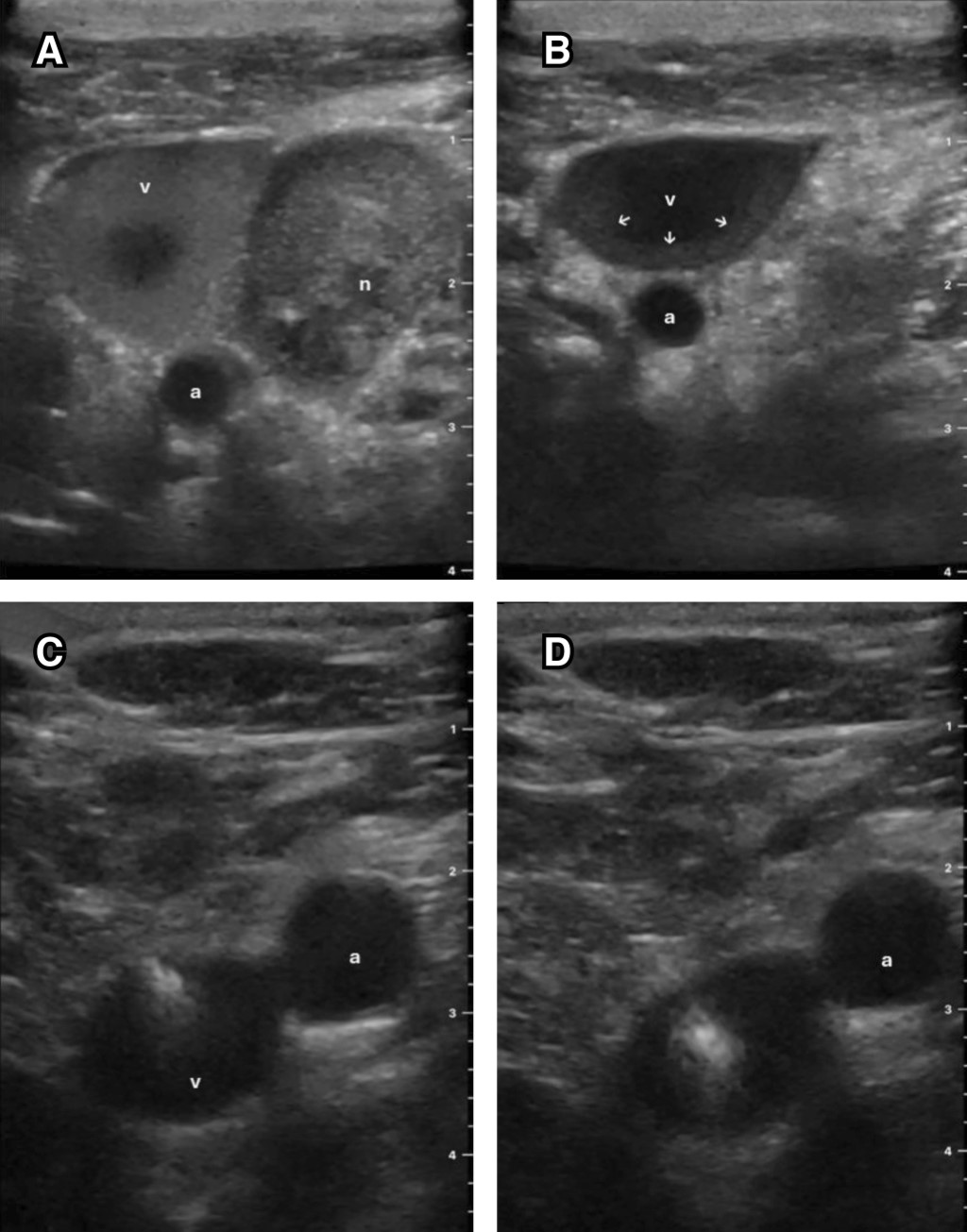 Por presentar inestabilidad hemodinámica, inician aminas vasoactivas vía periférica y posteriormente intentan la colocación de CVC en la región yugular y subclavia derecha en múltiples ocasiones. Logrando puncionar las venas y obtener retorno venoso, pero sin conseguir el paso de la guía metálica, con "acodamiento" de la misma. Se realizó rastreo vascular ecográfico con el que se observan múltiples adenopatías cervicales perivasculares, acompañadas de congestión venosa yugular y fenómeno de autocontraste (Figura 1). Se decide entonces colocar un CVC femoral izquierdo, por ser el mejor sitio disponible; se consigue al primer intento y sin complicaciones. Posteriormente, mediante tomografía axial computarizada (TAC) contrastada de tórax, se observó un gran tumor mediastinal y trombosis venosa asociada que ocasionaba síndrome de vena cava superior, lo cual no permitía el paso de la guía metálica.