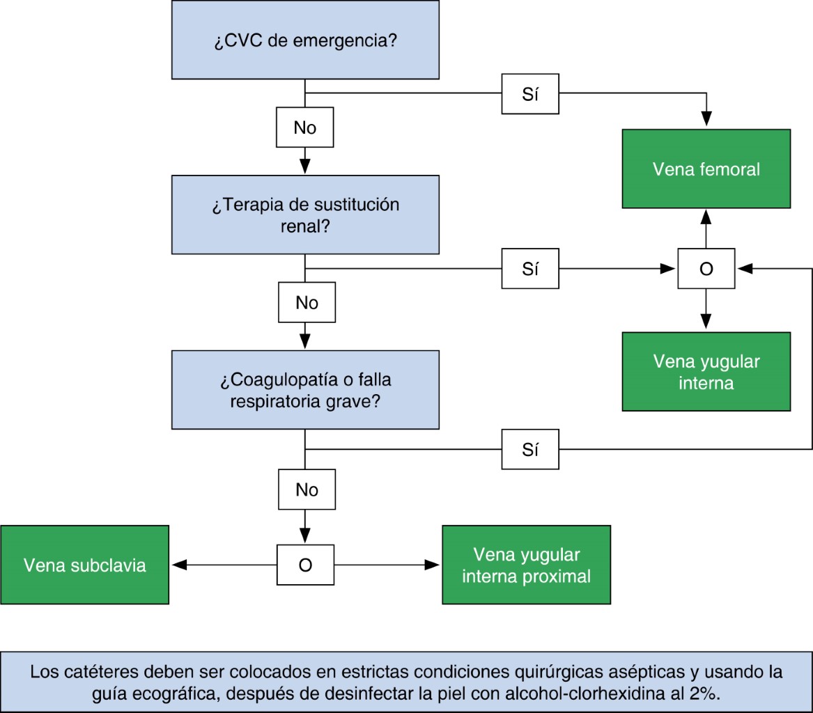 El CVC yugular es técnicamente menos demandante y fácil de colocar que el CVC subclavio; la incidencia de malposición del catéter es menos frecuente con el CVC yugular. Por otro lado, el riesgo de punción arterial es menos frecuente con el CVC subclavio en comparación al yugular o femoral, pero controlar el sangrado en la arteria carótida o femoral, es más fácil que en la arteria subclavia debido a que no es un sitio que se pueda comprimir.20 Como se puede observar, no existe un sitio "ideal" para colocar un CVC; sin embargo, podemos encontrar un sitio "optimo" para cada paciente. La decisión debe ser tomada de forma individualizada, con base en las características anatómicas y el contexto clínico, así como los recursos disponibles y la experiencia del operador.