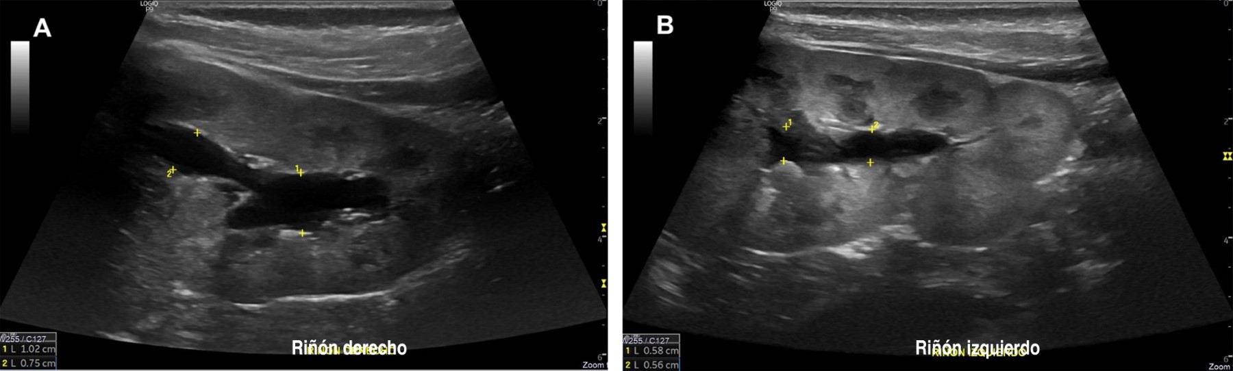 Con el enfoque de nefrología pediátrica el diagnóstico se orientó hacia una alteración tubular, incluyendo tubulopatía perdedora de sodio como el síndrome de Bartter. En este contexto, se solicitó la medición de aldosterona y actividad plasmática de renina, cuyos resultados fueron elevados. Los valores específicos de todos los estudios realizados, incluidos los cálculos correspondientes, se resumen en la Tabla 1. Como parte del abordaje, se realizó un ultrasonido renal que mostró, como único hallazgo, ectasia pielocalicial pasiva bilateral (Figura 1). Estas alteraciones, junto con las manifestaciones previamente mencionadas, fortalecieron la sospecha diagnóstica, por lo que se decidió iniciar tratamiento con aporte oral de potasio y sodio en forma de cloruro, indometacina y un inhibidor de bomba de protones (para proteger la mucosa gástrica).