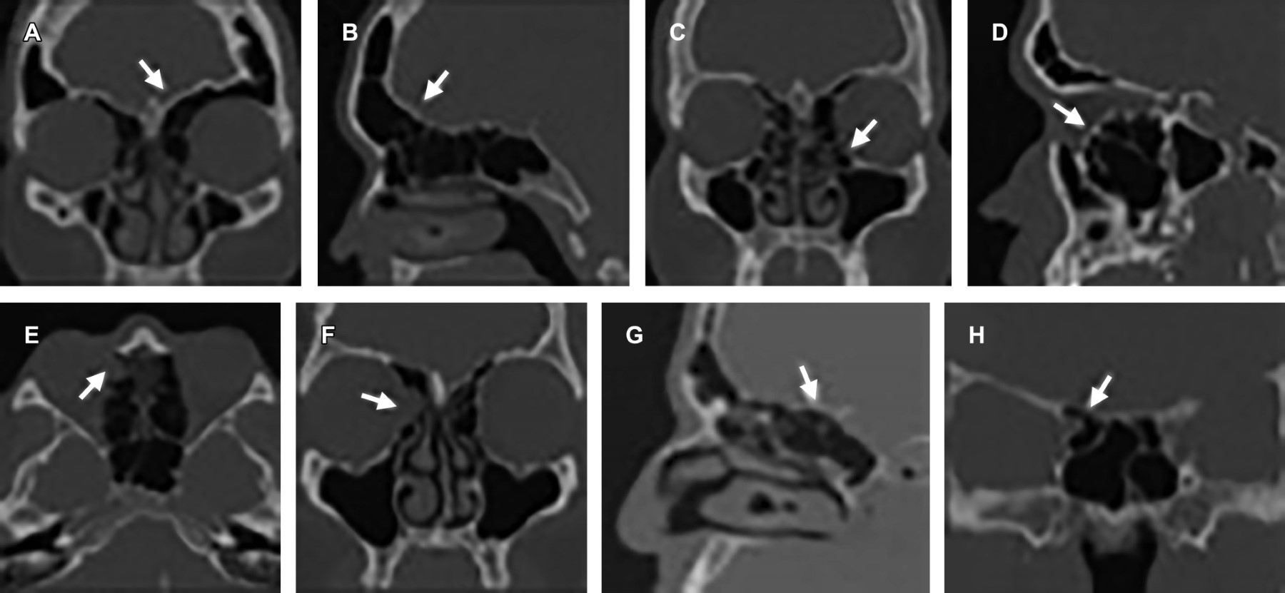 La celdilla etmoidal más anterior, que se extiende anteriormente en el hueso lacrimal, también recibe el nombre de "celdilla de agger nasi". Superior a la misma, se puede identificar diverso número y grado de neumatización de celdillas frontoetmoidales. Su relevancia radica en que provee un acceso quirúrgico al ostium primario del seno frontal y su resección permite permeabilizar el drenaje, en los casos en los que exista patología del mismo. Wormald y colaboradores mencionan y validan la clasificación de "International Frontal Sinus Anatomy Classification (IFAC)" para describir las variantes anatómicas de la región frontal previo a cirugía endoscópica funcional,11 para con ello disminuir la necesidad de reintervención o persistencia de sintomatología. Se identifican en aproximadamente 3 a 100% de los pacientes, margen amplio a causa de su definición operacional.6,12 En nuestra población se utilizó el concepto anteriormente mencionado, identificándolas en 95% de los estudios. Por ello es imperativo no sólo reconocerlas, sino profundizar en la descripción del grado de neumatización y relación respecto al ostium de drenaje del seno frontal en el reporte tomográfico.