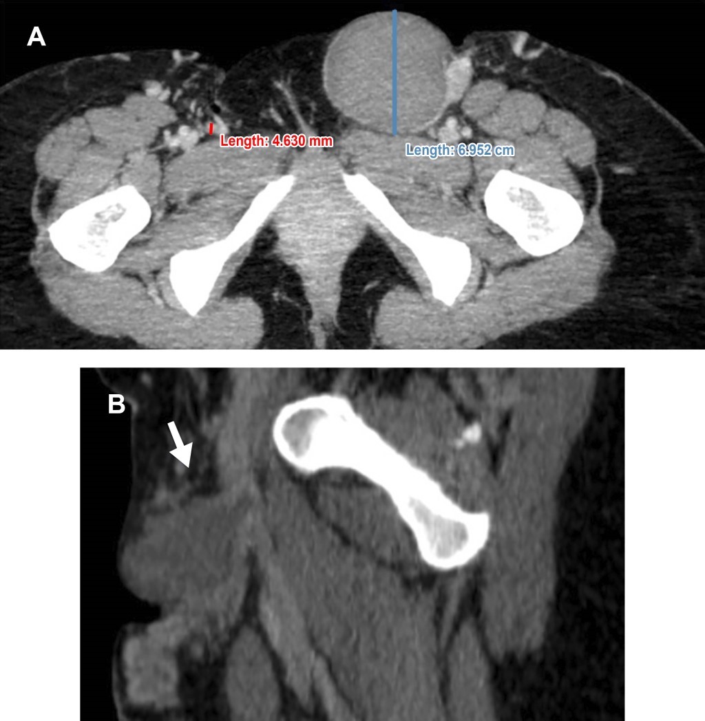 A la inspección se observan trayectos varicosos trombosados en segmento correspondiente de safena accesoria anterior. Angiotomografía con hallazgo de aneurisma venoso de 6.9 cm diámetro mayor, dependiente de safena mayor en su Union Safeno Femoral (USF), con relación a 4 mm de safena mayor contralateral (Figura 1).