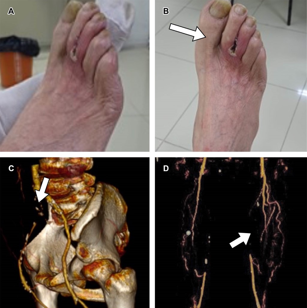 Al examen físico: miembro pélvico izquierdo sin lesiones isquémicas, sin embargo, no presenta pulsos desde región femoral hasta región pedia. Miembro pélvico derecho con presencia de poiquilotermia, atrófico, necrosis seca interdigital entre el segundo y tercer ortejo sin presencia de pulsos desde región femoral hasta región pedia (Figura 1A y B). TAC mostró evidencia de enfermedad aortoiliaca según la clasificación Trans-Atlantic Inter-Society Consensus (TASC) D (Figura 1C y D).