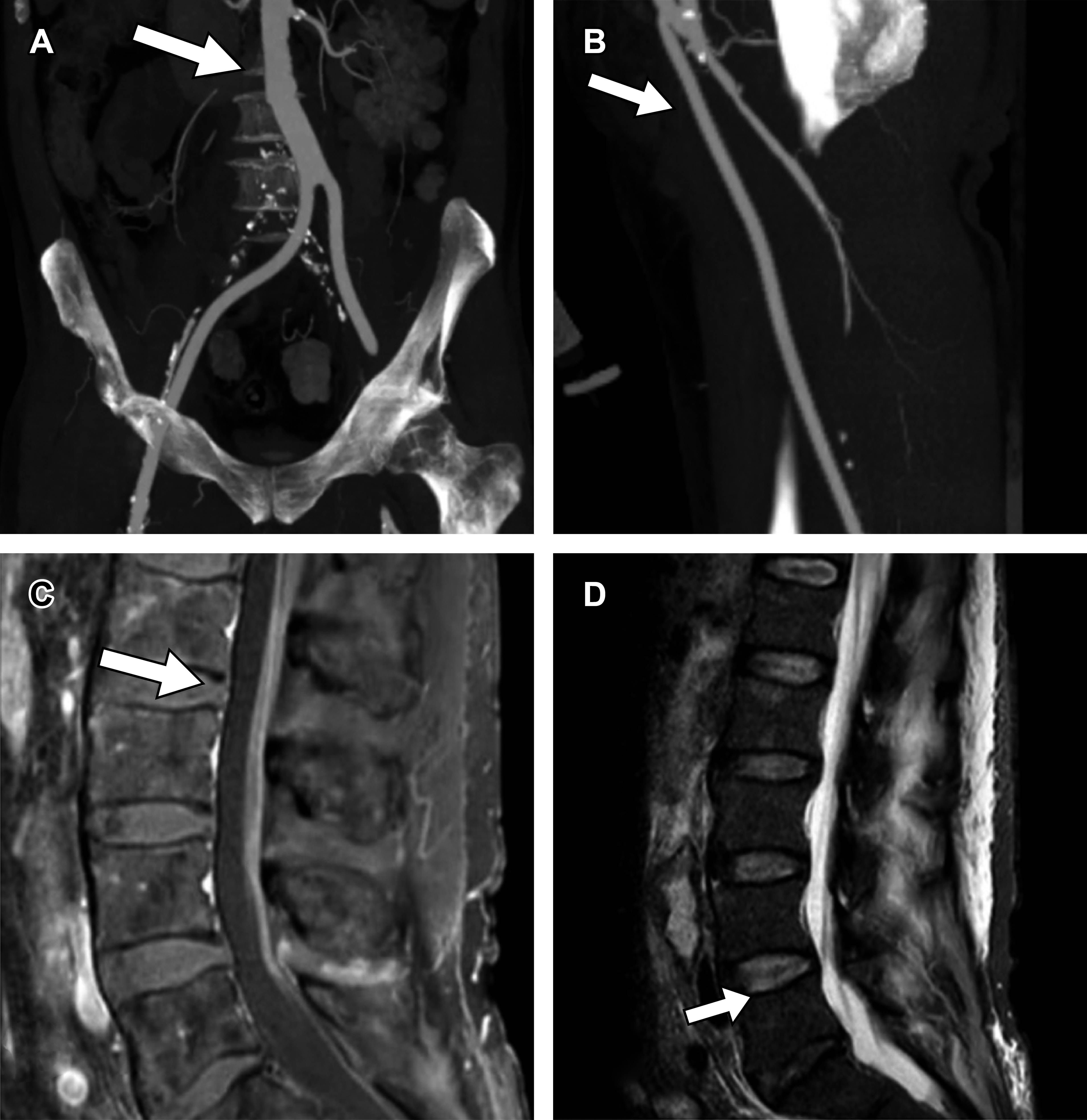 La isquemia medular se presenta posterior a un déficit de irrigación por sus arterias principales en la médula espinal, entre algunos otros factores. Su presentación habitual es debilidad de miembros inferiores, asociada a pérdida sensitiva. La sospecha diagnóstica es clínica, confirmándose mediante tomografía computarizada (TAC) o resonancia magnética (RM). El riesgo de isquemia medular es de 0.3 a 6.5% en el manejo de enfermedad aortoiliaca por aterosclerosis.1,2