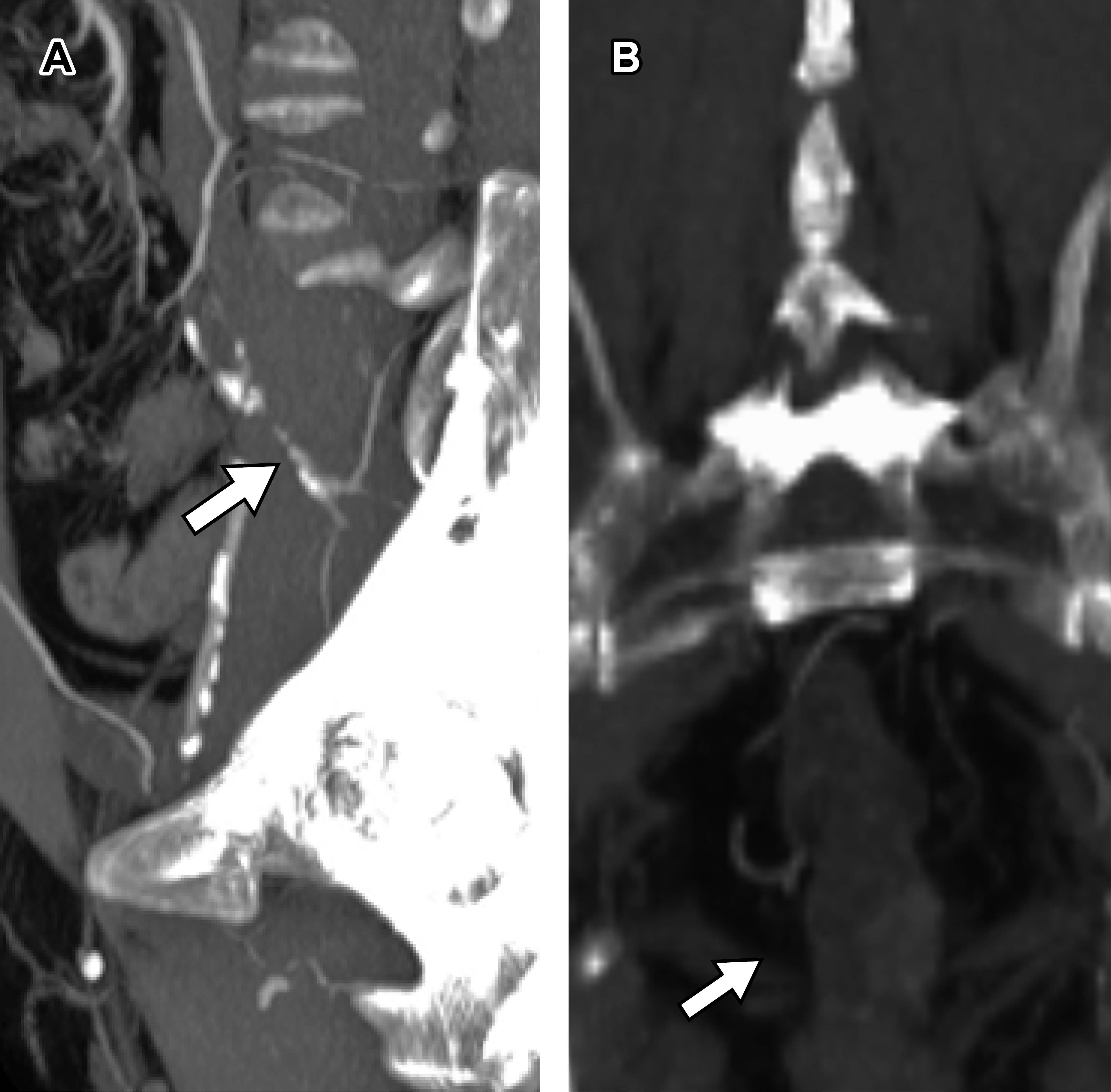 Asimismo, el paciente presentó una importante colateralidad de predominio sistémico por medio de arterias hipogástricas, iliolumbares y sacras como origen de las arterias radiculares que no compensan en el segmento inferior (Figura 3B). Está descrito el drenaje de líquido cefalorraquídeo como un método de protección para la isquemia medular; Bertoni y colaboradores mencionan una serie de protección medular solo en pacientes donde se cubrió toda la aorta torácica, y en caso de abordar la aorta abdominal solo si la aorta torácica había sido intervenida previamente, por lo que como medida profiláctica está fuera de escenario.4