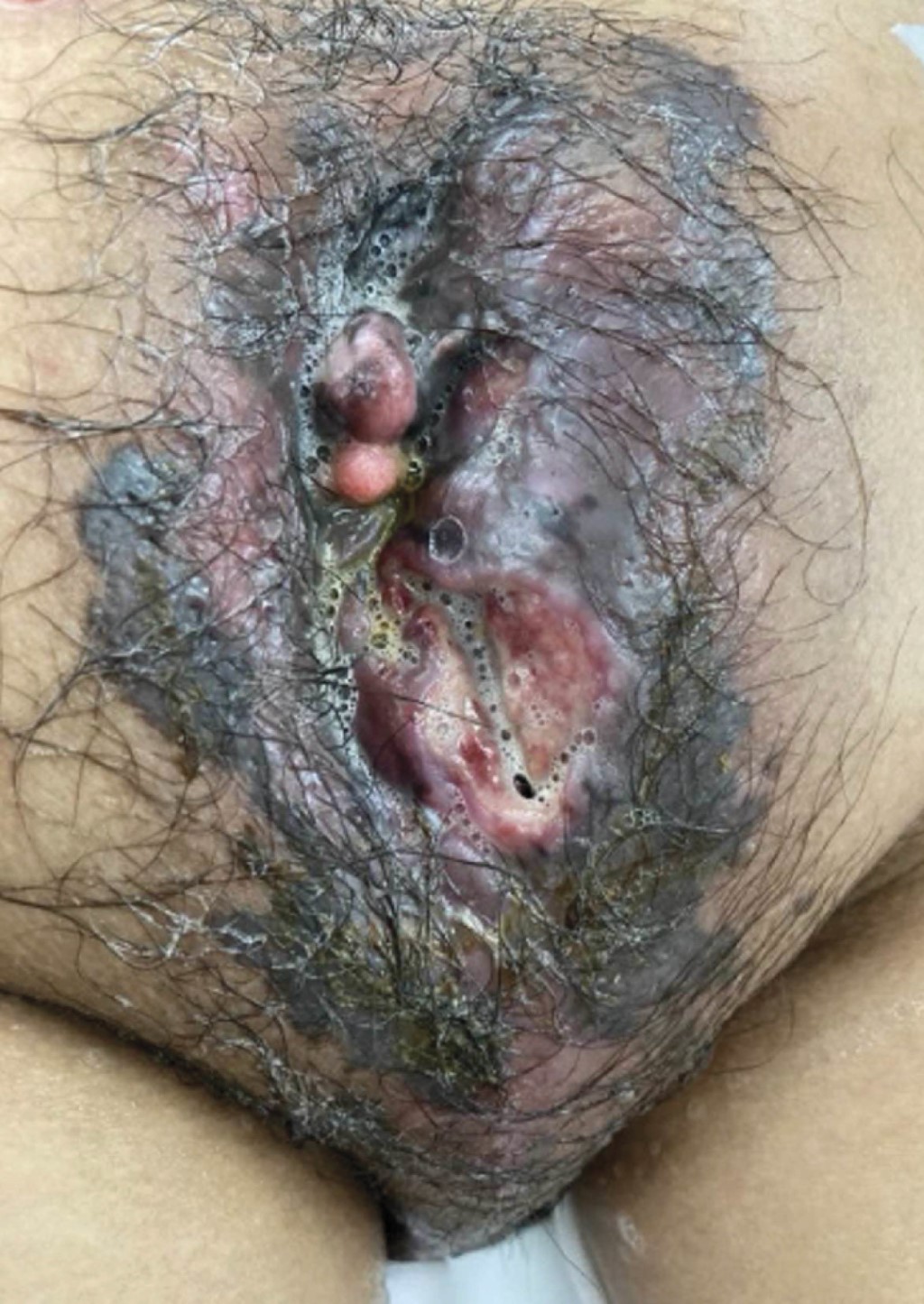 A la exploración física se encuentra una tumoración anal de 15 × 9 cm eritematosa, ulcerada e indurada, con edema isquiorrectal, perineal y de la región escrotal. Con salida de material purulento isquiorrectal derecho y perineal (Figura 1), se complementa exploración con tacto rectal y posterior proctosigmoidoscopia hasta 12 cm después del margen anal en donde se observan plexos hemorroidales internos congestivos, trayecto fistuloso anterior y lateral en el radio de las 11 a dos centímetros del margen anal.