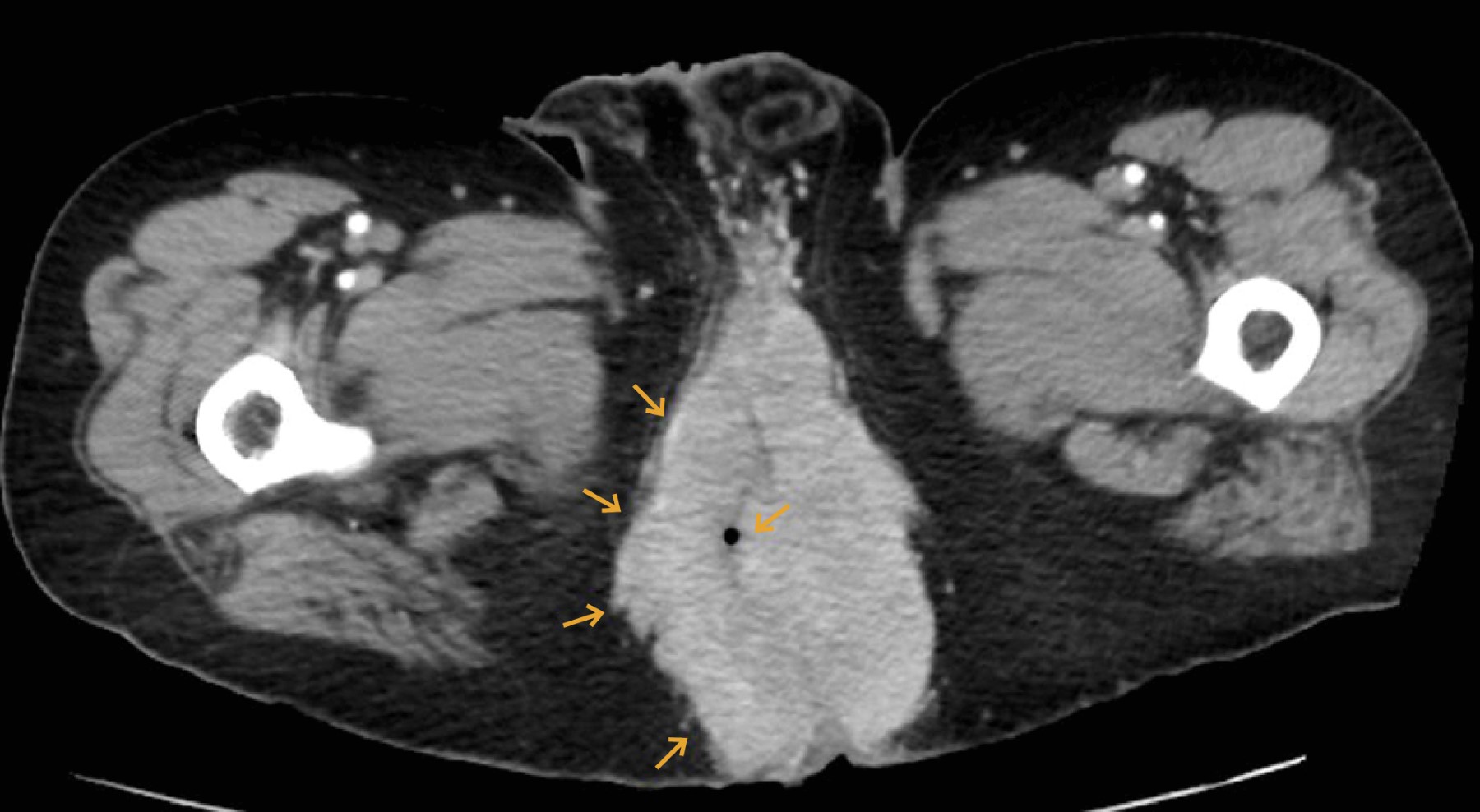 Para complementar la exploración, se solicitó una tomografía abdominopélvica (Figura 2) que evidenció infiltración a nivel de la región perineal con medidas de 15.3 × 9.3 × 11.6 cm de bordes lobulados y mal definidos, así como una colección extensa que afecta el piso pélvico, región perianal y el margen escrotal posterior.