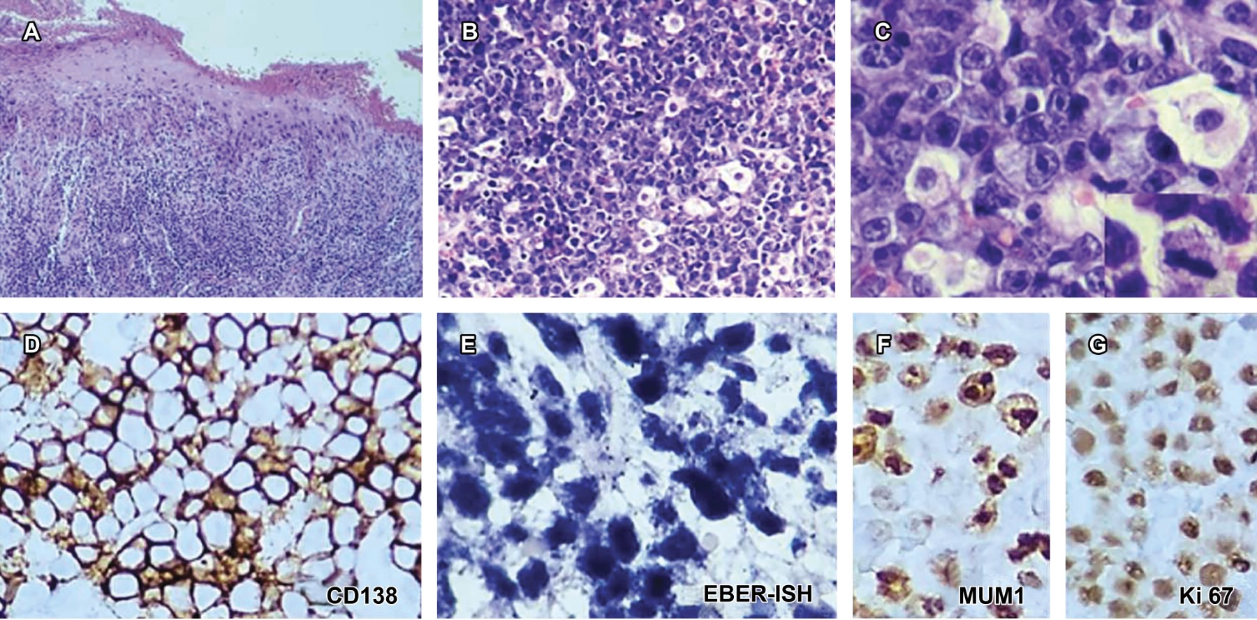 El linfoma plasmablástico fue descrito en 1997 y se incluyó en la clasificación de la OMS en 20085 como una variante del linfoma difuso de células B grandes, diferenciándose por la no expresión de CD-20 y por la expresión de marcadores de células plasmáticas como CD-138 y MUM-1.1,5 El diagnóstico, en este caso, se realizó de forma definitiva mediante inmunohistoquímica.
