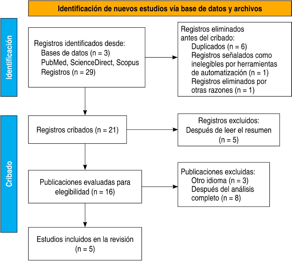 La búsqueda electrónica identificó 29 estudios, de los cuales ocho fueron excluidos debido a que eran duplicados, filtros automáticos de búsqueda o que no eran relevantes para el estudio. Dejando 21 artículos para su análisis completo, 16 fueron excluidos después de su análisis completo, leer el resumen o estaban en otro idioma, finalmente cinco artículos cumplieron los criterios de selección y fueron incluidos en la revisión (Figura 1).