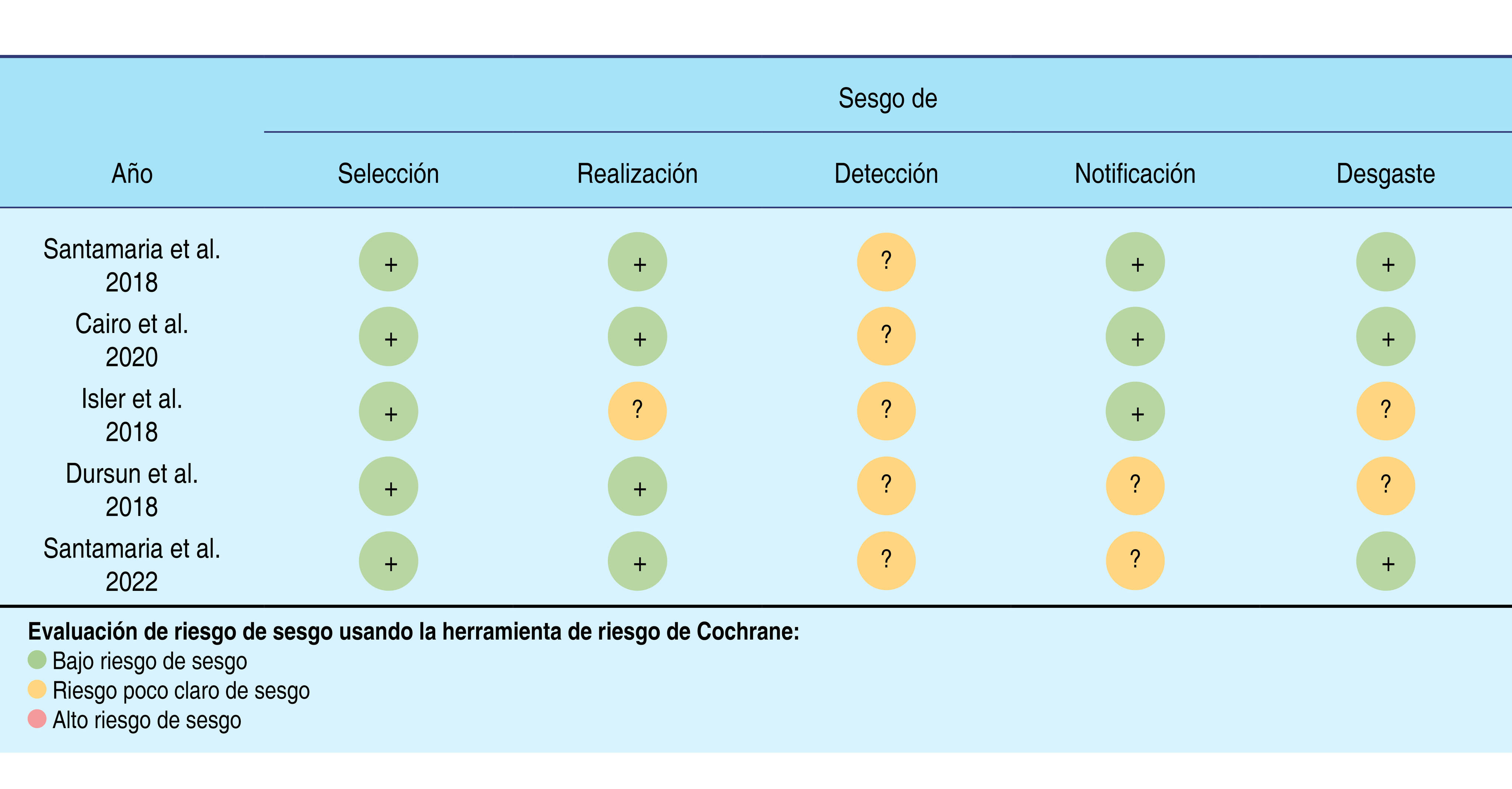 La descripción general del estudio incluyó información sobre el diseño del mismo, tratamiento periodontal, material restaurador utilizado, metodología, tiempo de evaluación y los resultados principales de los estudios. También se proporciona un resumen del riesgo de sesgo en los estudios individuales utilizando las herramientas de riesgo de Cochrane y en análisis de calidad Jadad.