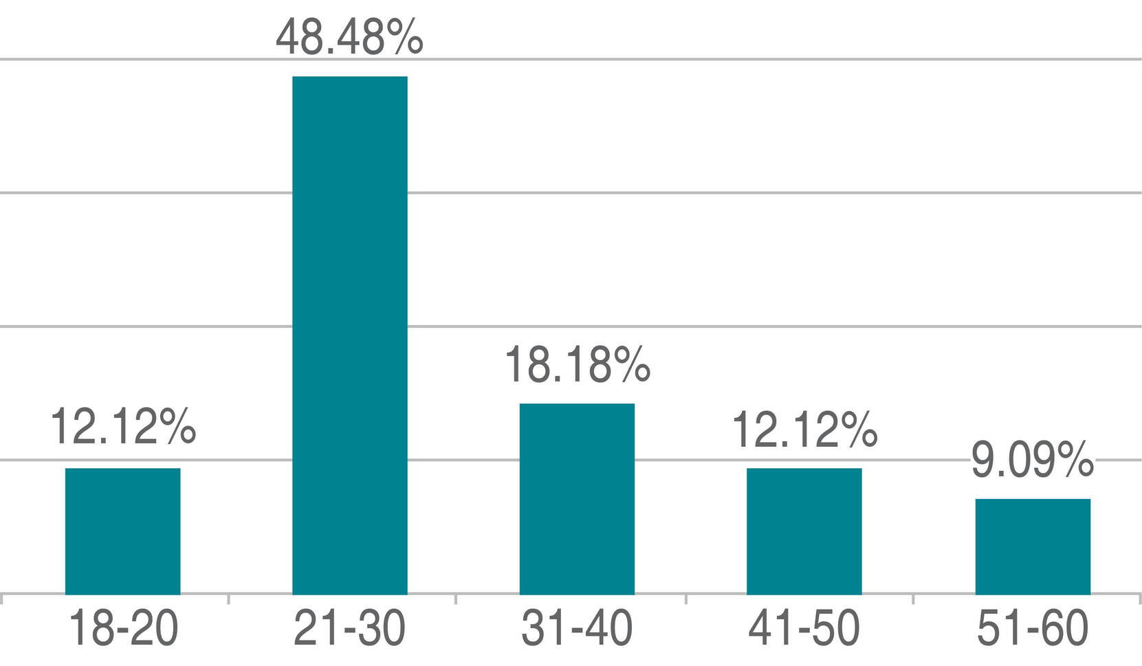 La distribución por edad se muestra en la Figura 1. Se apreció que 48% de los usuarios se encontraron en el rango de edad de 21 a 30 años, seguido de 31 a 40 años en 18%.
