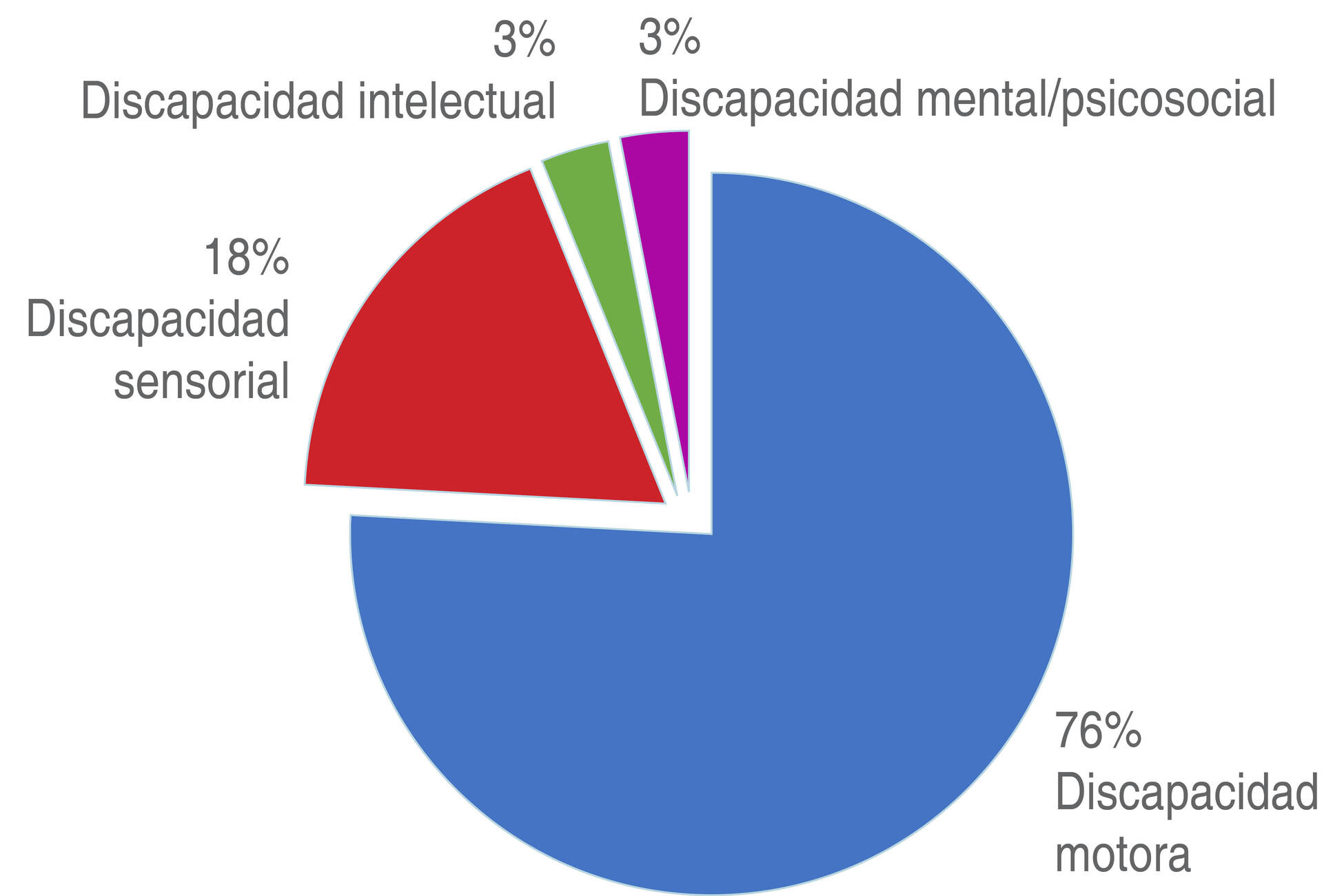 Referente al tipo de discapacidad, prevaleció la motora con 25 usuarios correspondiente a 76% seguida de la discapacidad sensorial con 18% (Figura 2).