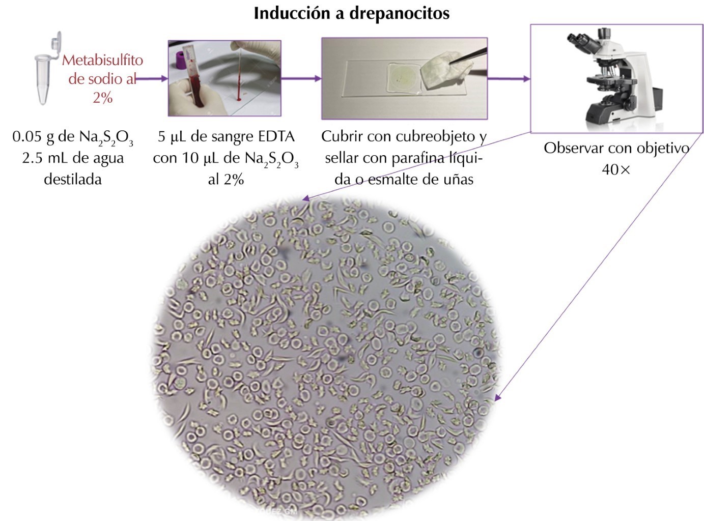 La inducción de drepanocitos se da cuando la tensión parcial de oxígeno es baja, los eritrocitos que contienen hemoglobina S adoptan la forma de hoz, falciforme o de drepanocito por formación de polímeros de desoxihemoglobina, que ocasionan la deformación intensa de los eritrocitos. Para inducir la formación de drepanocitos in vitro, se expone la sangre total en estado de desoxigenación a metabisulfito de sodio (Na2S2O3) al 2%.6,7