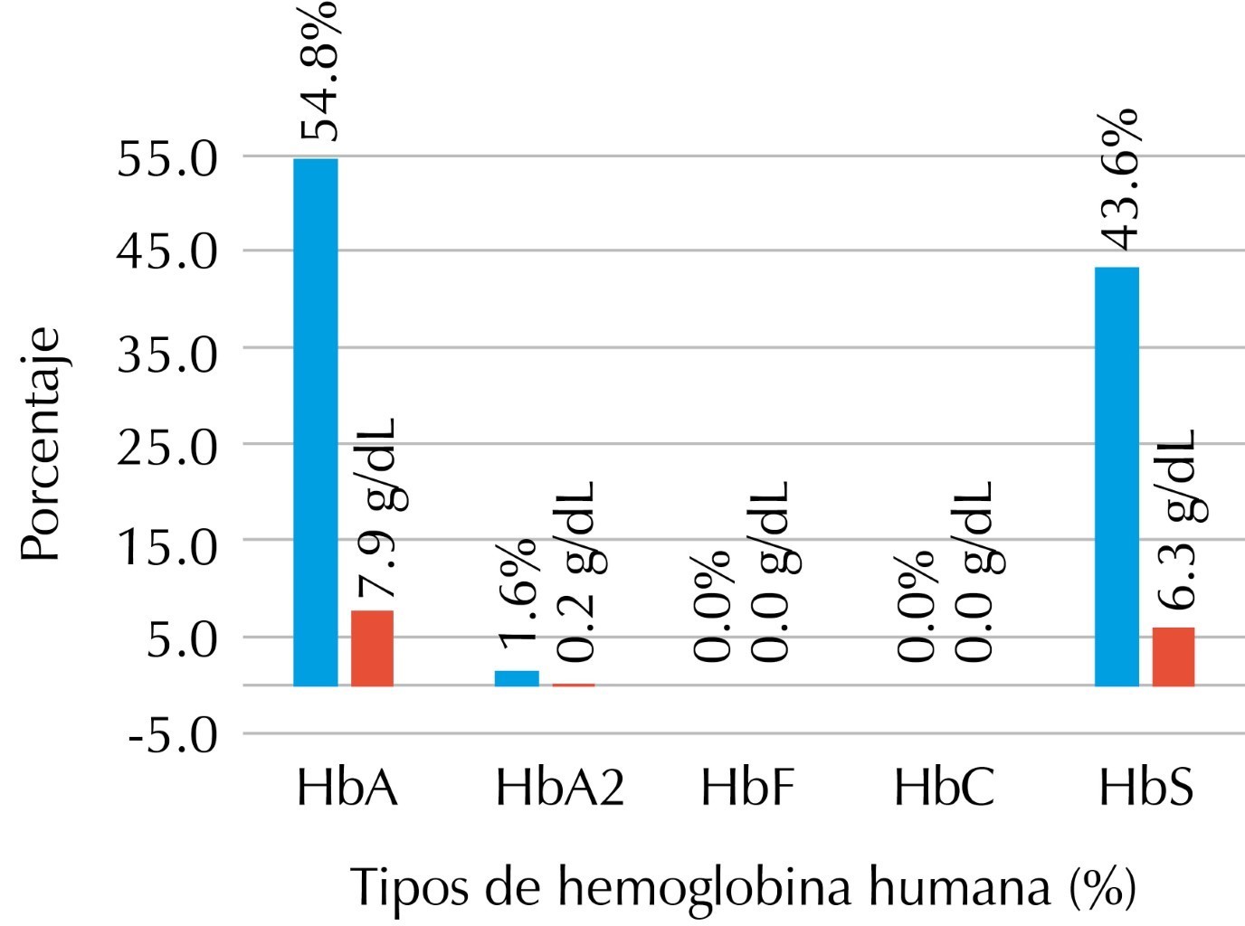 Los resultados de las electroforesis de hemoglobina arrojaron un promedio de 54.8% de HbA, 1.6% de HbA2 y 43.6% de HbS (Figura 3).