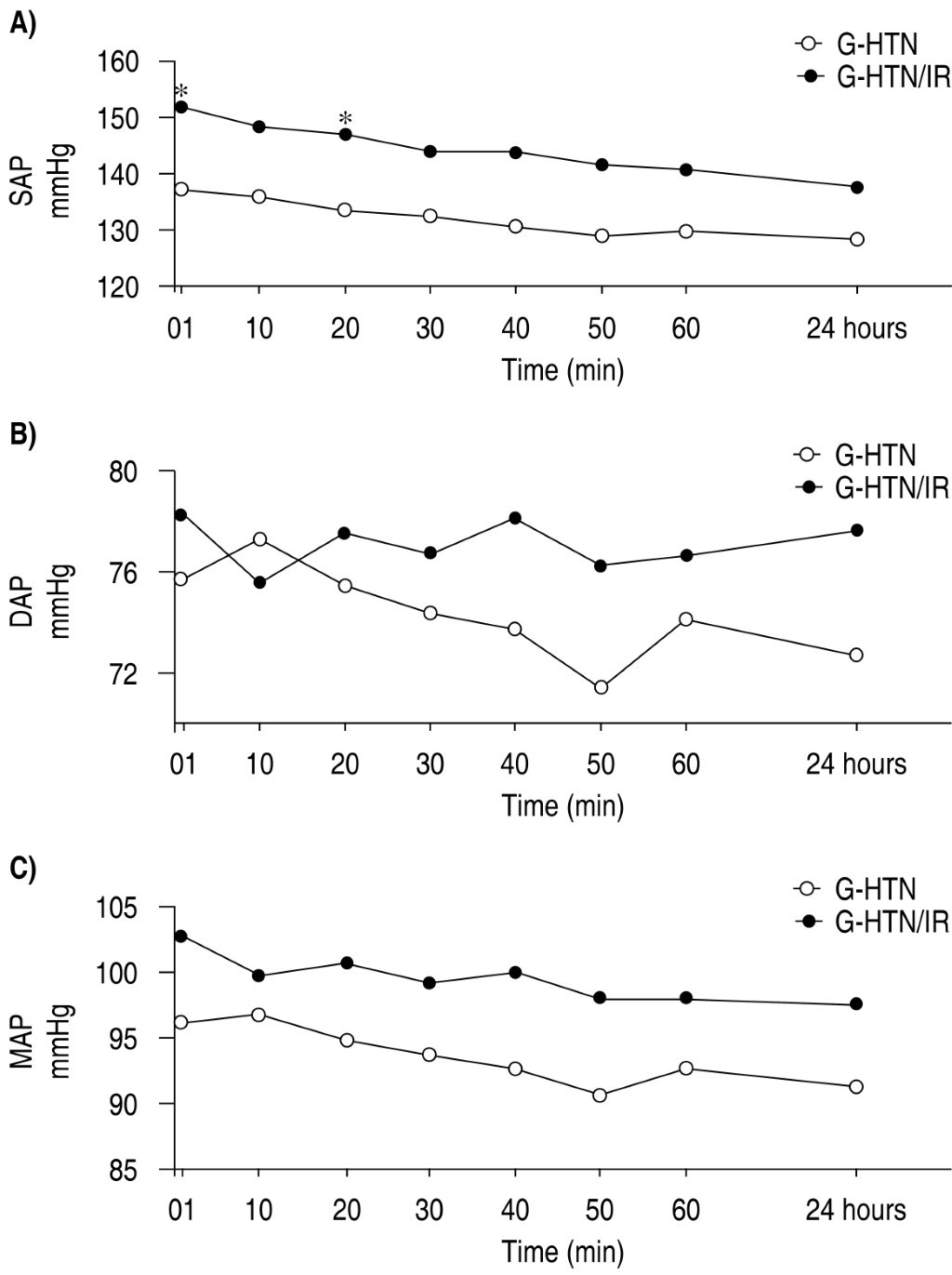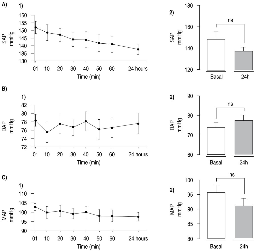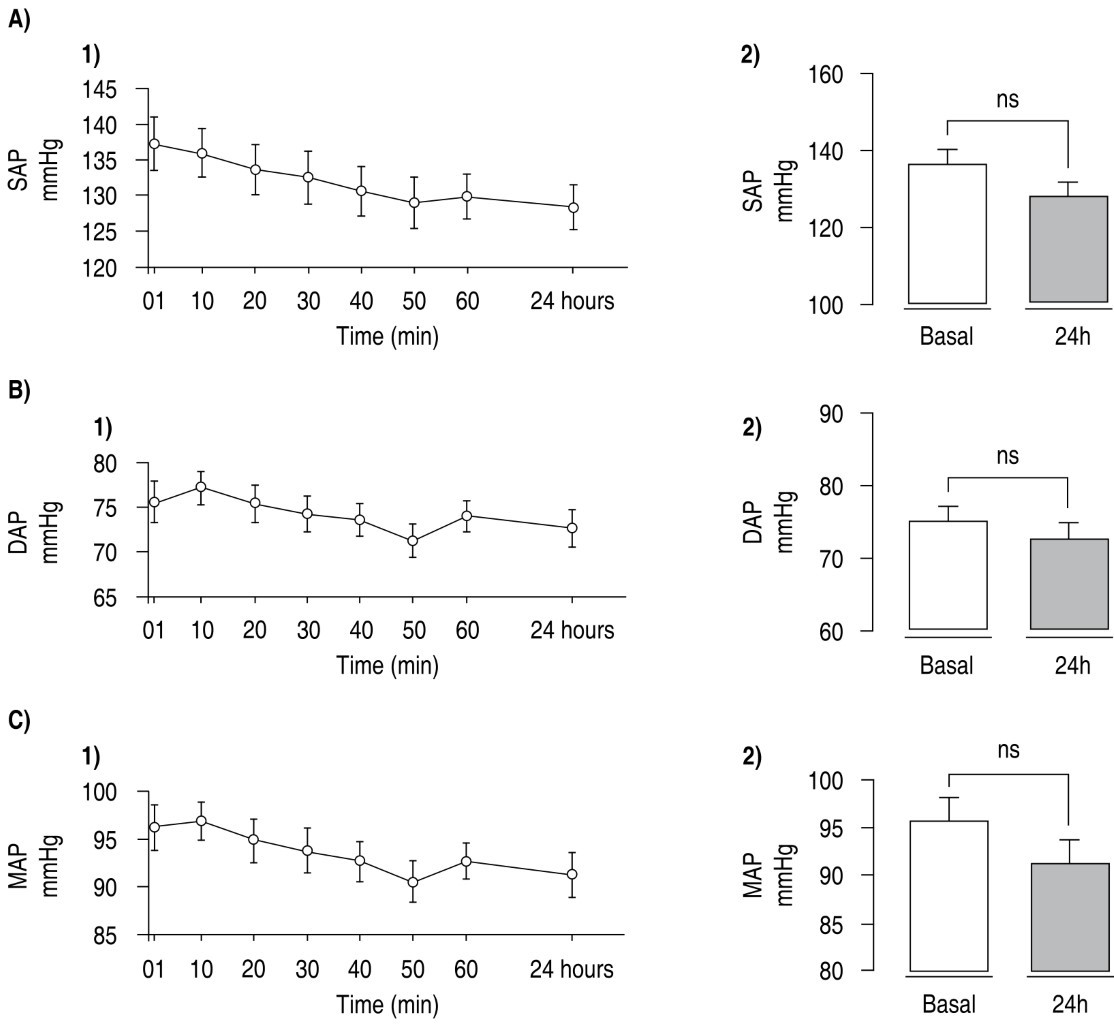 Resultados: se encontraron diferencias significativas en la presión arterial sistólica (PAS) entre los grupos en los minutos uno y veinte, mientras que la presión arterial diastólica (PAD) y la presión arterial media (PAM) no mostraron diferencias significativas. Ambos grupos mostraron reducciones de la PAS y la PAM, con descensos de −8.21 mmHg (PAS) y −4.49 mmHg (PAM) en G-HTN, y de −11.3 mmHg (PAS) y −1.43 mmHg (PAM) en G-HTN/IR.