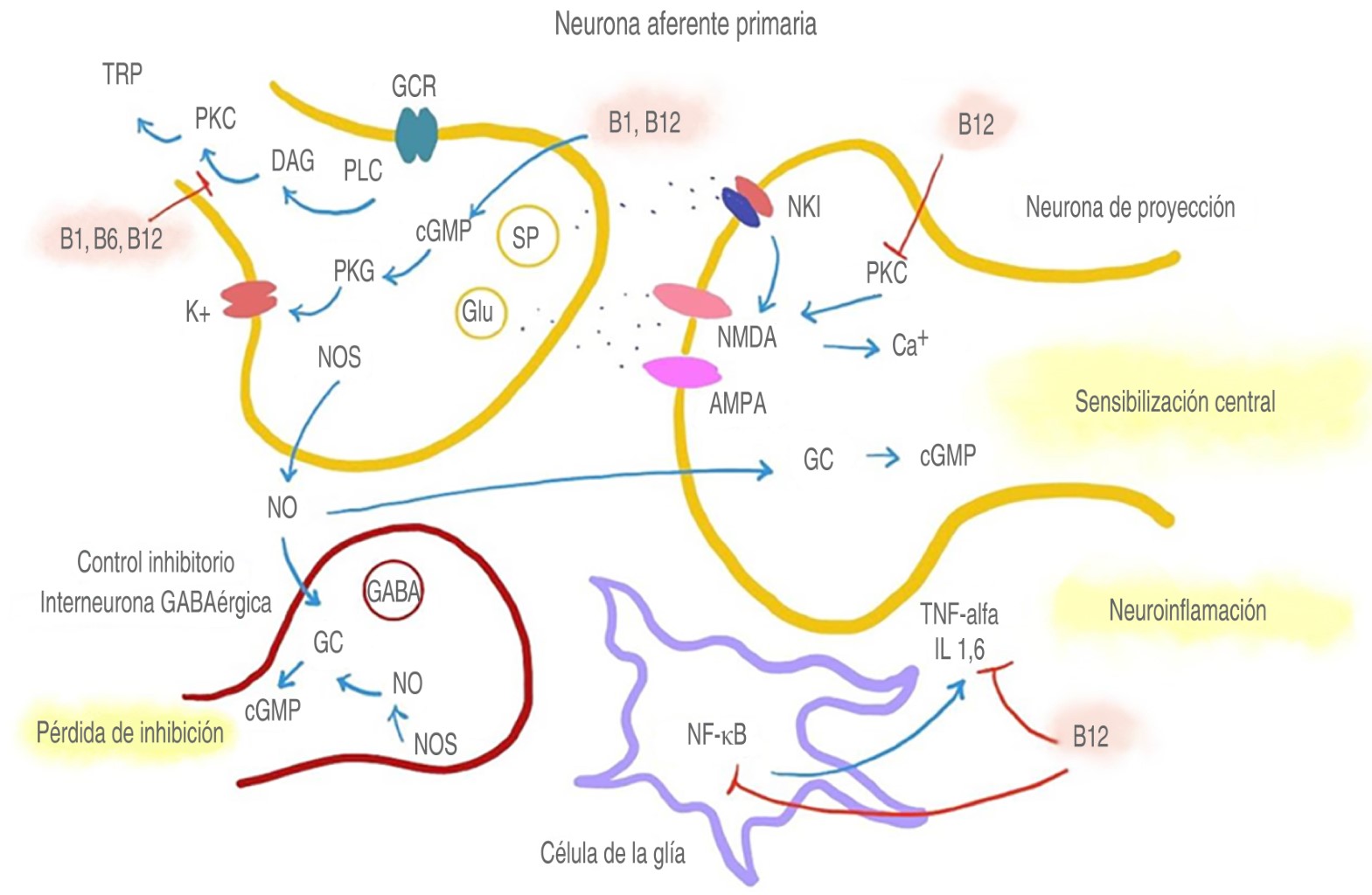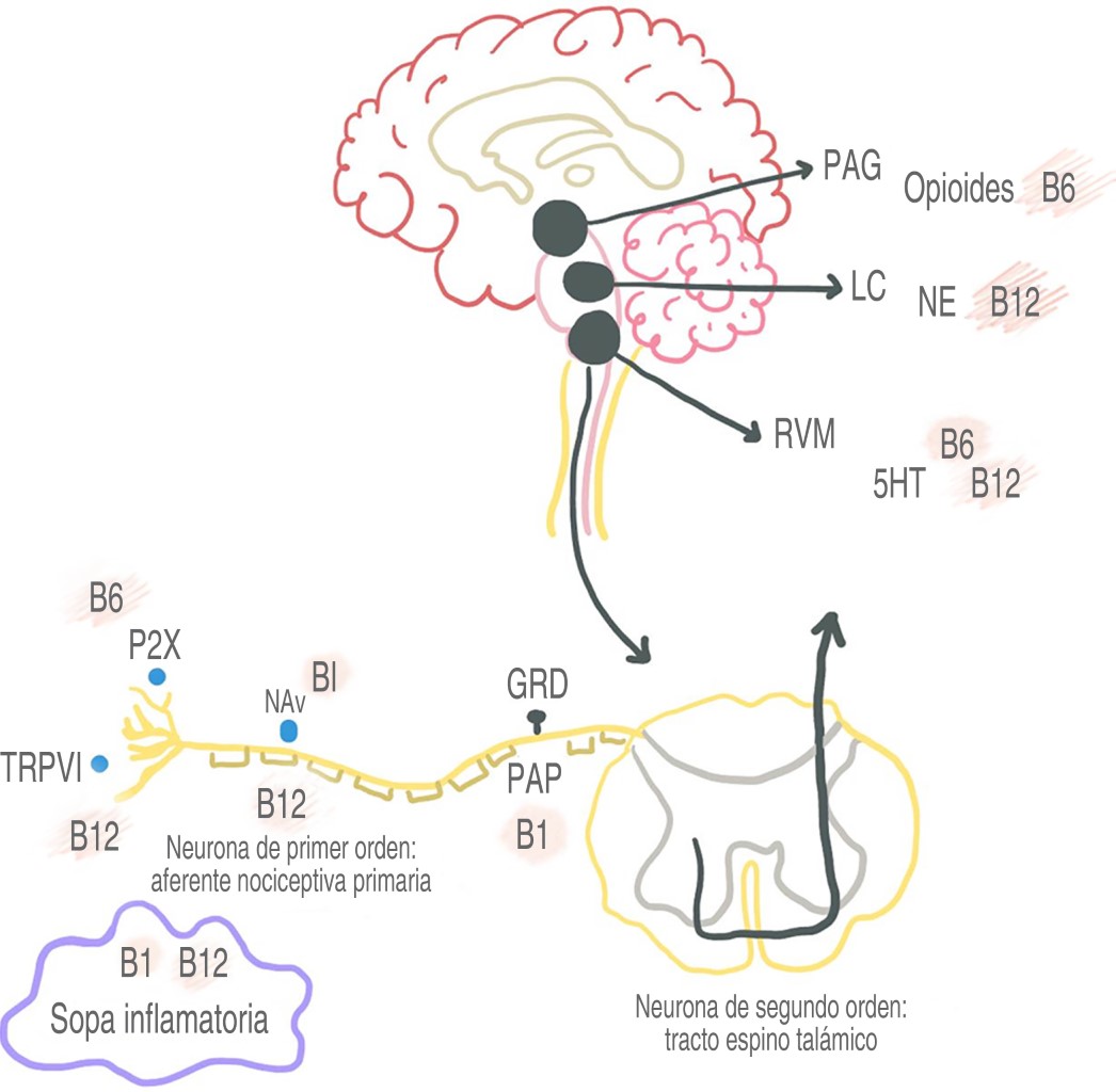 El efecto antineuropático del complejo de vitaminas B se describen en las Figuras 1 y 2 (B1, B12), posiblemente se relacione con el impacto en los ganglios de las raíces dorsales (DRG) al participar en la modulación de las corrientes de sodio, en receptores de sodio dependientes de voltaje (Nav) y de los receptores de potencial de voltaje transitorio (TRPV), reduciendo la hiperexcitabilidad neuronal (sensibilización periférica) y de ahí su efecto antihiperalgésico(16). (B6, B12) Se ha identificado que en afección de las fibras aferentes distales disminuye el estrés oxidativo, reduciendo el daño neuronal(16).