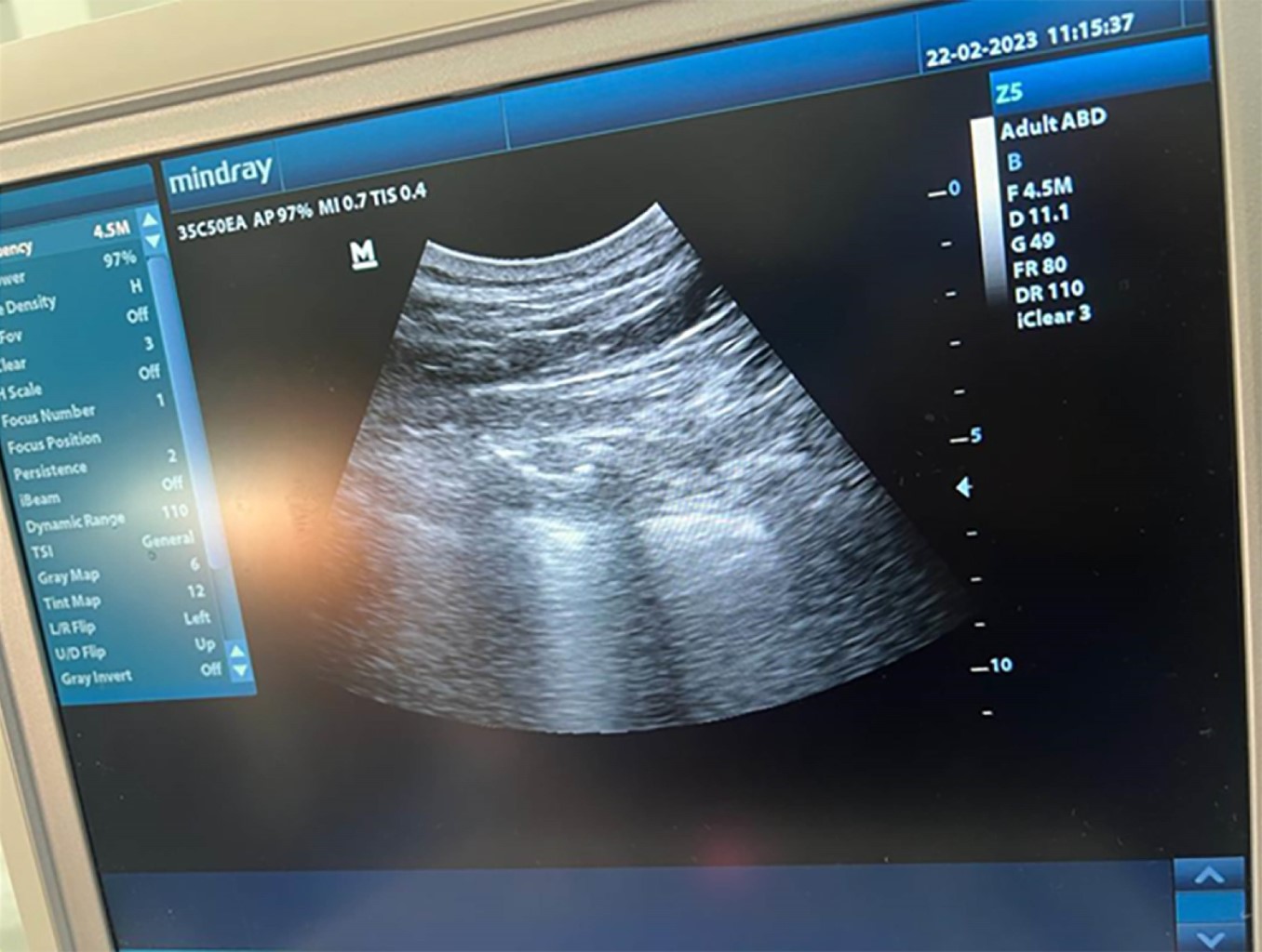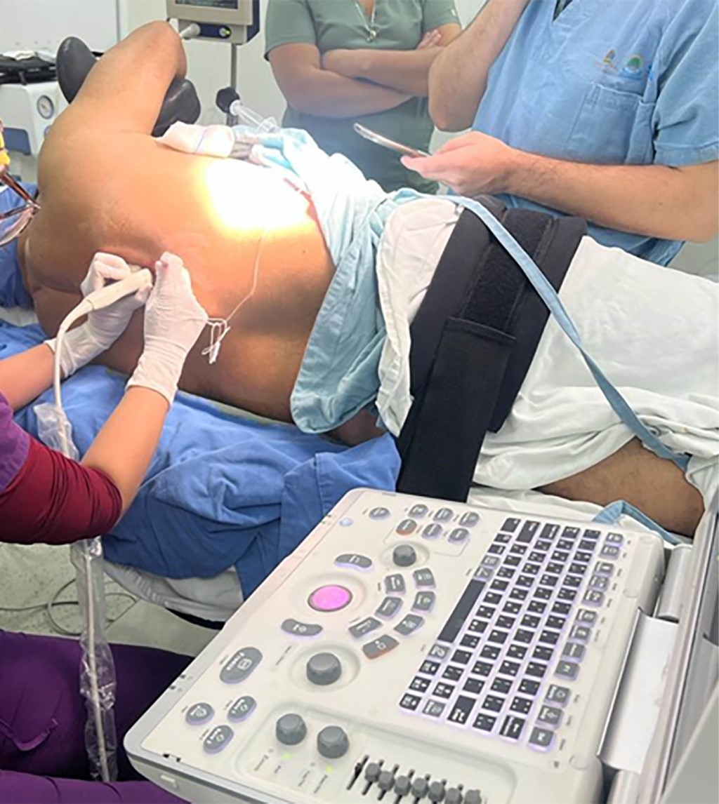 Se utilizó monitoreo no invasivo con oximetría de pulso, presión arterial no invasiva, electrocardiograma continuo y monitoreo del índice biespectral. Con el paciente en decúbito lateral, se procedió a realizar de forma ecoguiada bloqueo paravertebral derecho a nivel de la sexta vértebra torácica (Figura 1) administrando ropivacaína a 0.75% 75 mg, con un volumen total de 10 mL y bloqueo del nervio intercostal derecho, sobre el noveno arco costal, adyacente a éste se administró de igual forma ropivacaína a 0.75% 7.5 mg, con un volumen total de 10 mL (Figura 2).