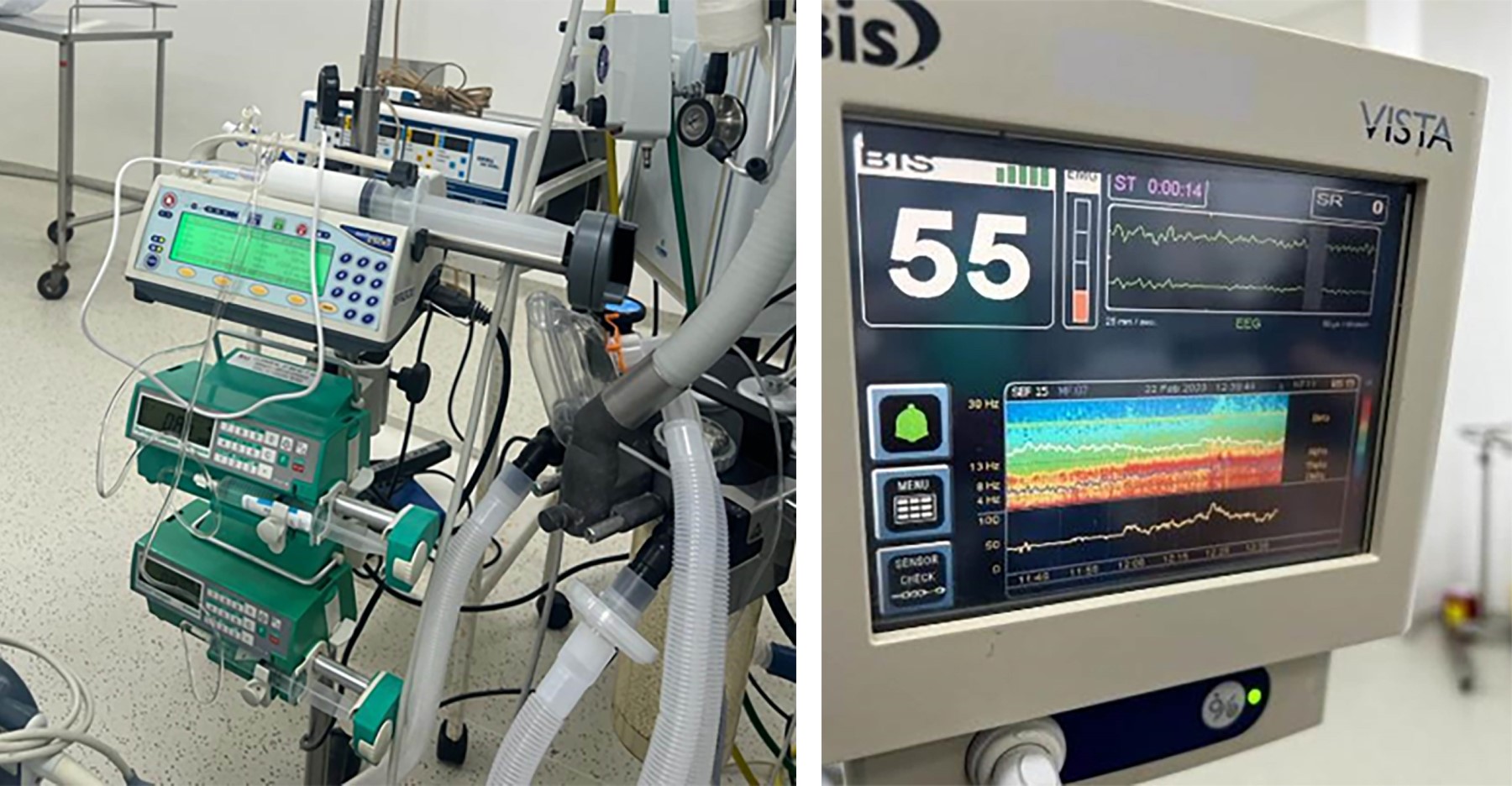 Para el mantenimiento de la anestesia se administró remifentanilo en perfusión de 0.005 μg/min, dexmedetomidina en perfusión de 0.3 a 0.5 μg/kg/h y propofol en perfusión de 3 a 5 μg/min (Figura 3).