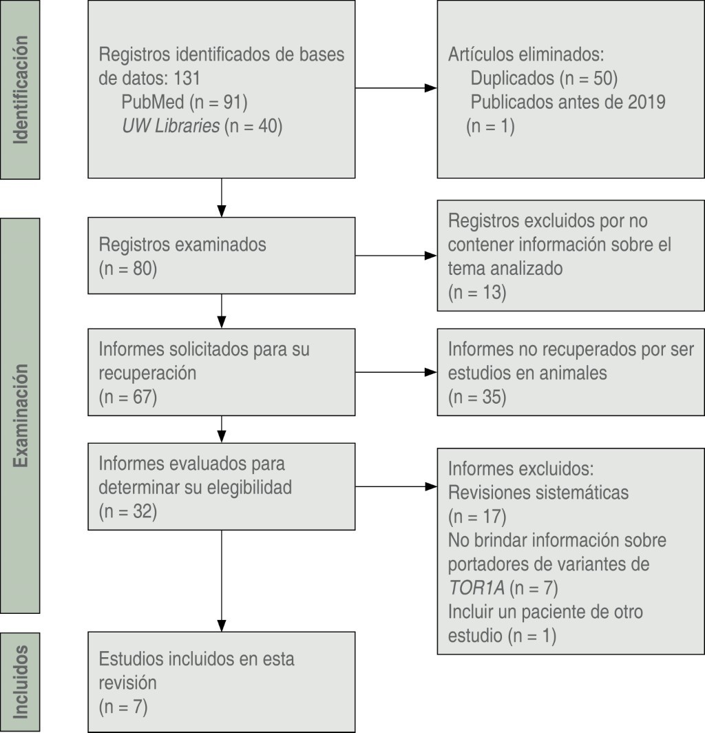 Se realizó una búsqueda bibliográfica en las bases de datos PubMed y UW Libraries (Universidad de Washington). En PubMed se realizó la búsqueda de artículos utilizando los términos MESH "Dystonia" y "Torsin A"; mientras que en la búsqueda libre se utilizaron las palabras clave "DYT-TOR1A", "TOR1A", y "Dystonia". En UW Libraries se realizó la búsqueda de artículos empleando las palabras claves "TOR1A" y "Dystonia". Los términos MESH y las palabras clave debían estar contenidos en el título y/o resumen. La selección de los reportes o estudios se llevó a cabo por dos autores (AR-G y BEP-A), y cuando existieron discrepancias fueron resueltas por un tercer autor. Se eliminaron los trabajos duplicados, considerando para ello el título y la información de los autores. Posteriormente se revisaron los resúmenes y se eliminaron los trabajos realizados en modelos animales o que no contenían información referente al tema de interés de esta revisión. Finalmente, se revisó el texto completo de los trabajos restantes y se seleccionaron aquellos reportes que incluyeran sujetos con diagnóstico de distonía generalizada y que fueran portadores de la variante c.907_909delGAG. Se extrajo la información sobre la edad de inicio de los síntomas, el sitio de inicio, la progresión de la enfermedad y el tratamiento utilizado en los trabajos seleccionados. Esta revisión sólo considera artículos publicados del 1 de junio de 2019 al 1 de junio de 2024), con el objetivo de ofrecer una visión general y crítica del estado actual del conocimiento sobre este tema en ese periodo. Sólo se incluyeron trabajos escritos en idioma inglés o español para asegurar una adecuada comprensión de los trabajos y evitar cualquier sesgo de la información en idiomas diferentes. Se excluyeron los artículos duplicados, con información no relacionada al tema, y aquellos que no contaran con la información requerida.