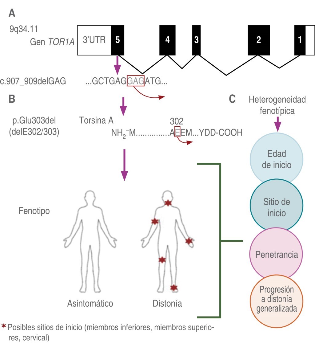 Dentro de las distonías genéticas, la DYT debida a variantes patogénicas del gen TOR1A (DYT-TOR1A) [MIM #128100] es la forma más común y presenta un modelo de herencia autosómico dominante. El gen TOR1A (Torsin family 1 member A) [MIM 1605204] se localiza en la región cromosómica 9q34.11 donde abarca una región de 11k pb; consta de cinco exones y codifica para la proteína denominada torsina A.4 La mayor proporción de casos de la DYT-TOR1A se deben a la deleción en fase del triplete GAG (c.907_909delGAG; rs80358233) localizado en el último de sus cinco exones, que ocasiona la pérdida de un ácido glutámico de la proteína (p.Glu303del o delE302/303).5